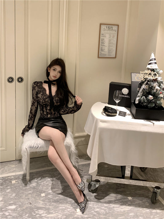 【Na+】嬌欲陷阱 蕾絲拼接假兩件式上衣 黑