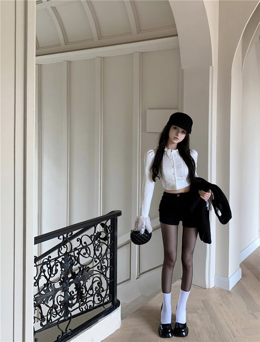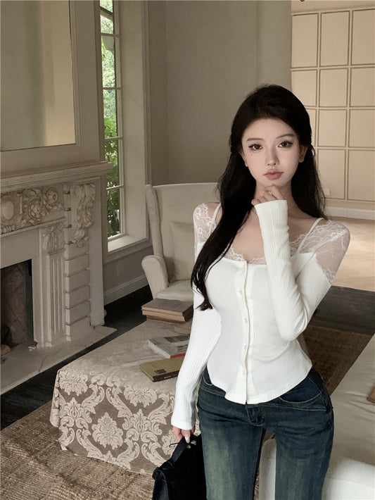 【Na+】嬌欲陷阱 蕾絲拼接假兩件式上衣 白