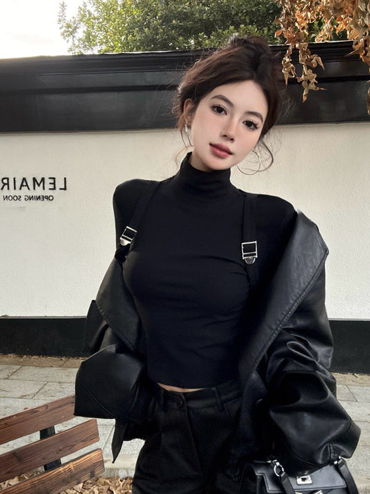 NA+ 酷颯美模揹帶設計感高領長袖上衣 黑