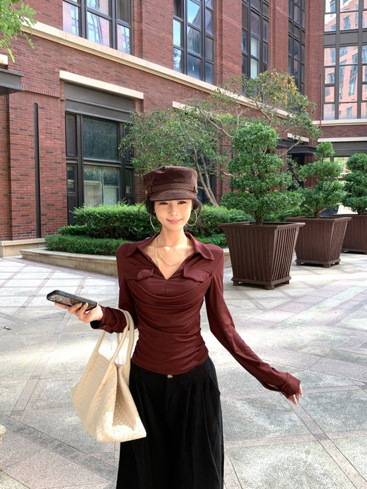 NA+ 俏皮復古荷葉領螺紋彈力打底上衣 杏色/深燕麥