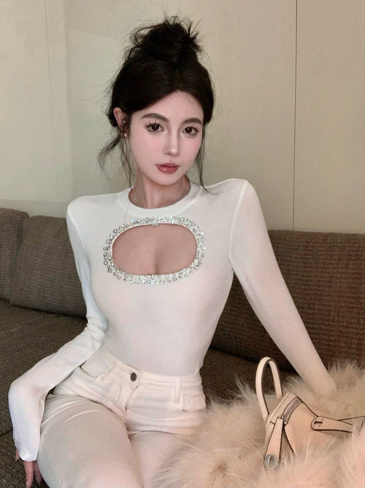 NA+ 純慾心機縷空鑲鑽圓領上衣 白