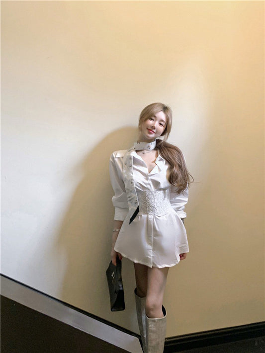 NA+ 氣質歸屬蕾絲腰封收腰襯衫裙 白
