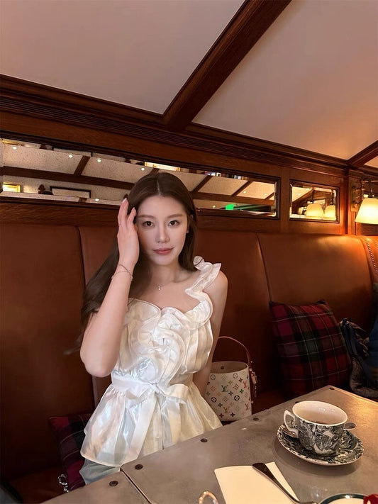 NA+ 娃娃vibe 重工魚線木耳邊繫帶上衣 白/黑