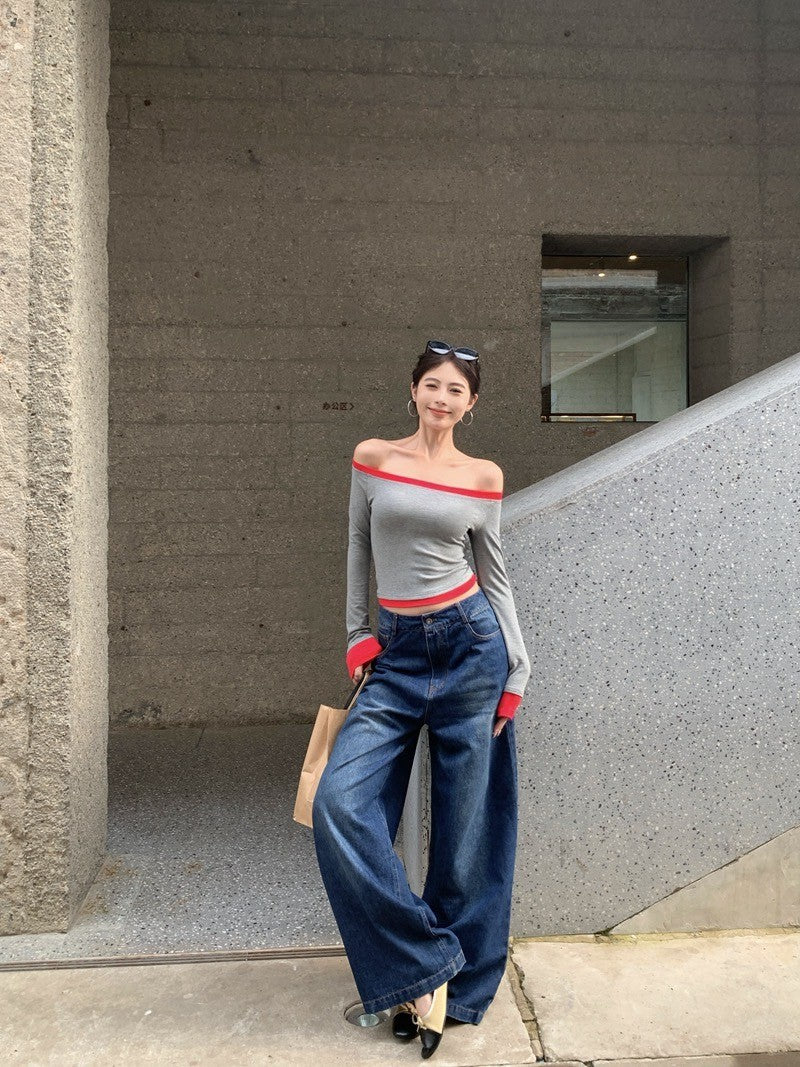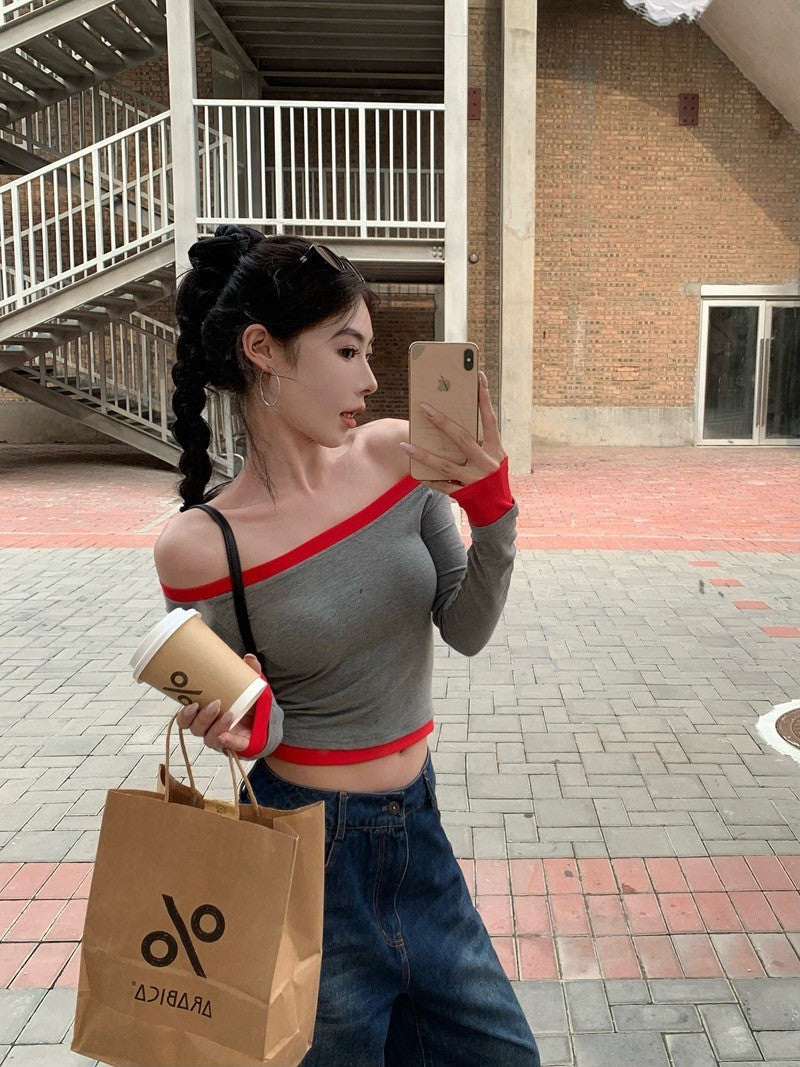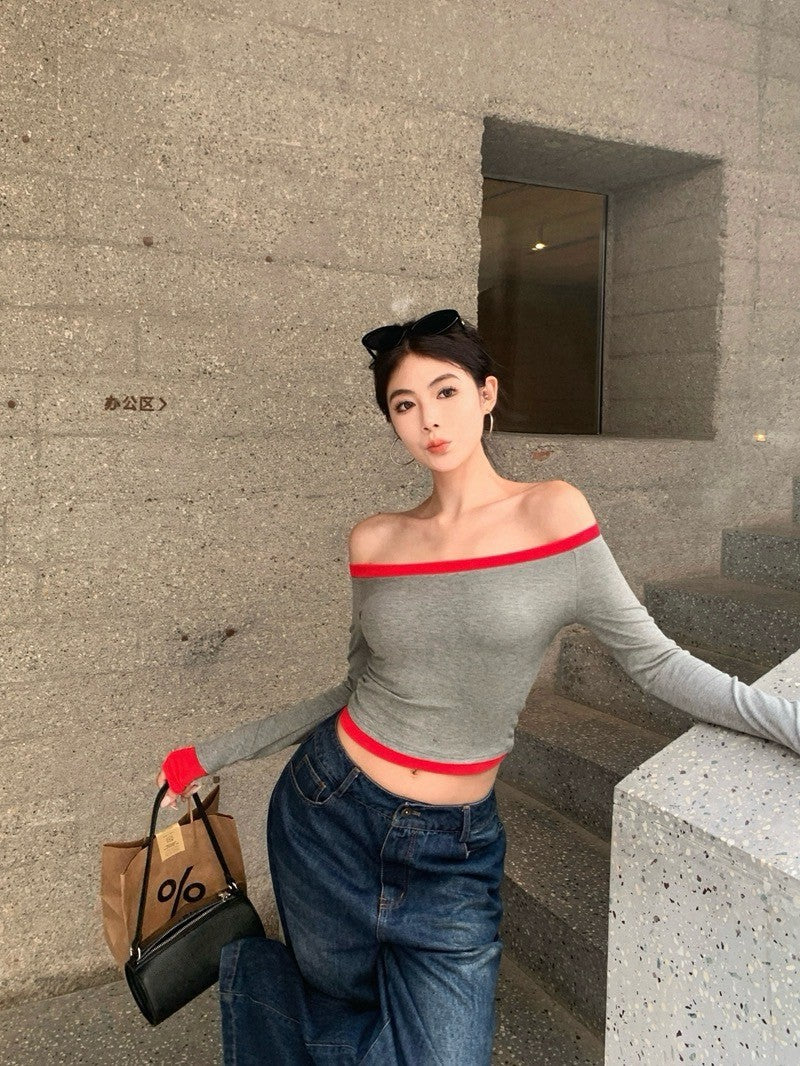 ''Na+''不分季節當辣妹 撞色包邊一字領彈力上衣 淺灰紅