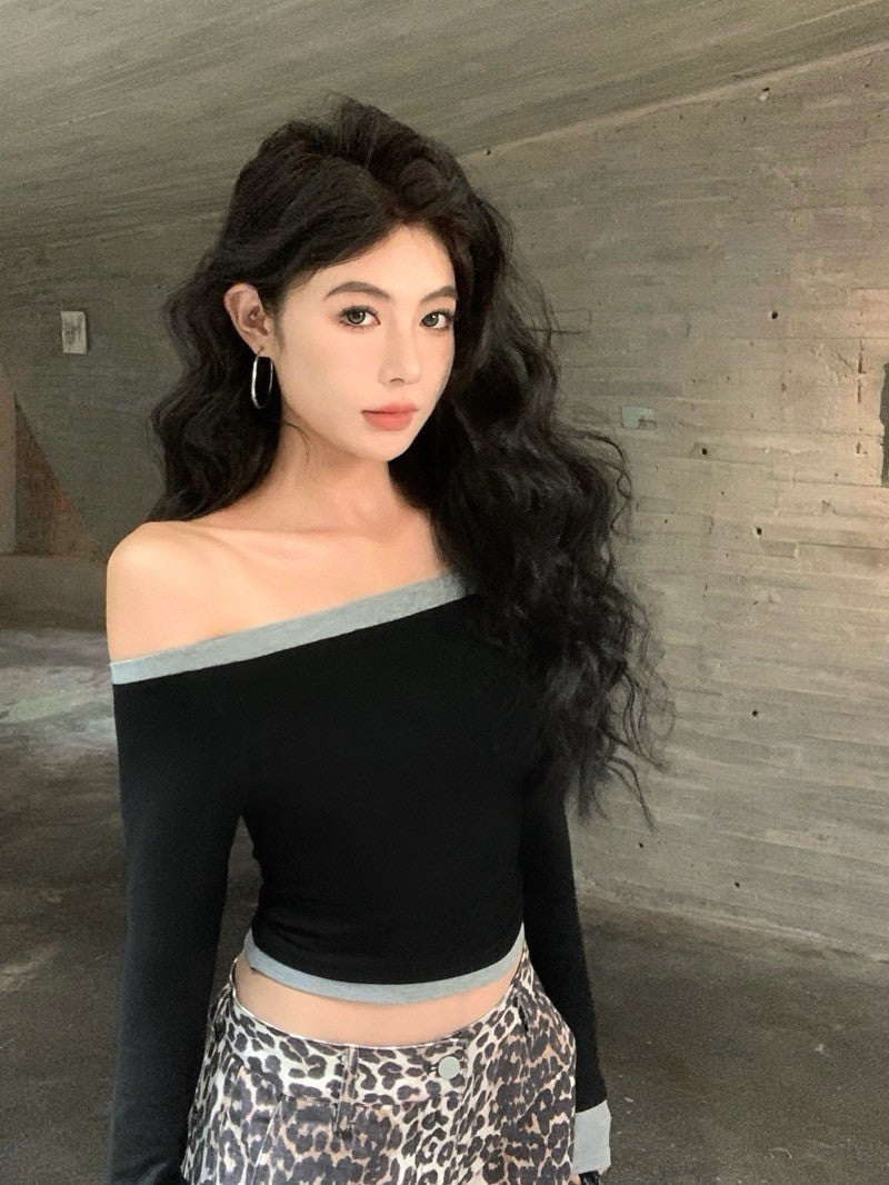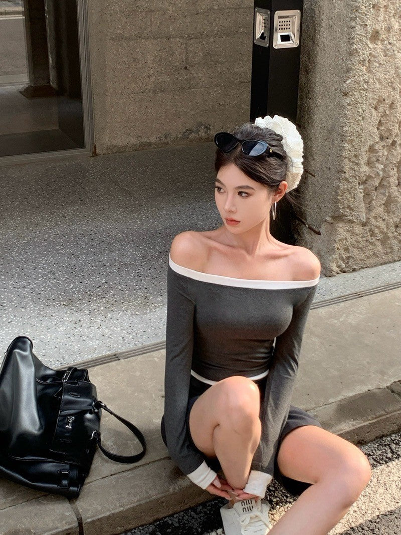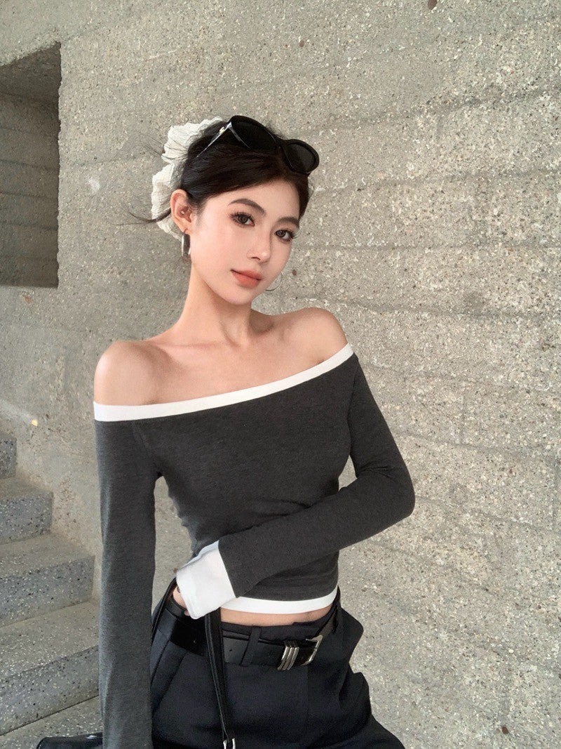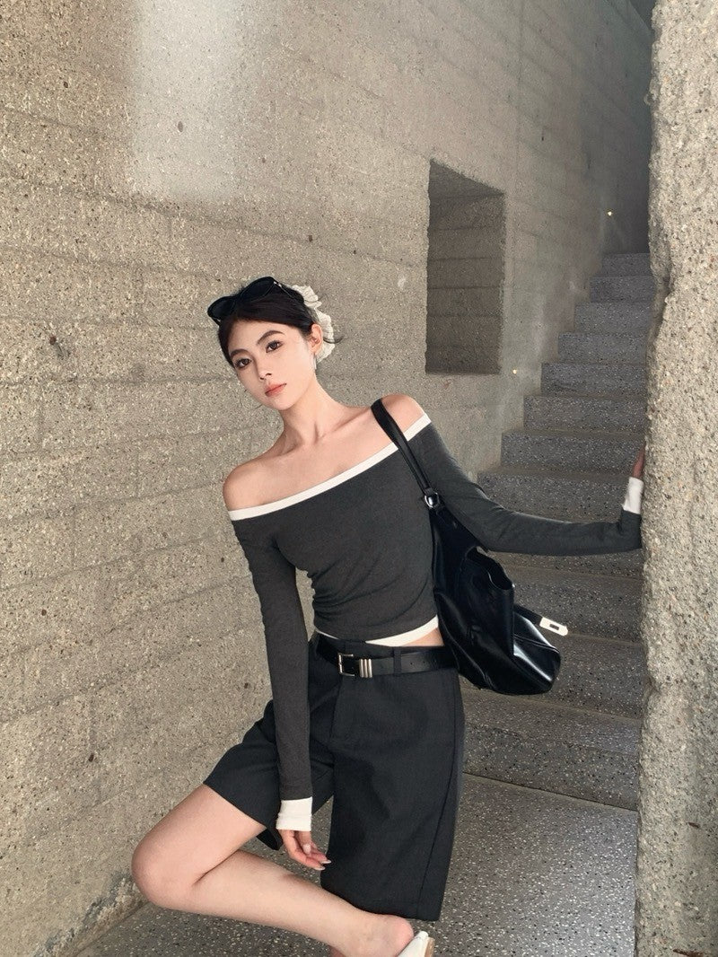 ''Na+''不分季節當辣妹 撞色包邊一字領彈力上衣 黑/深灰