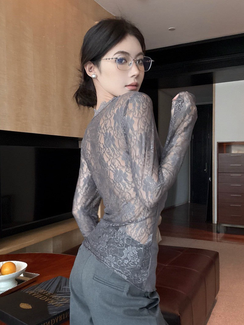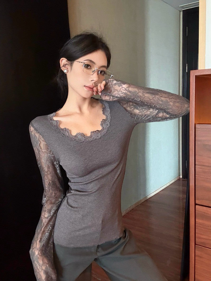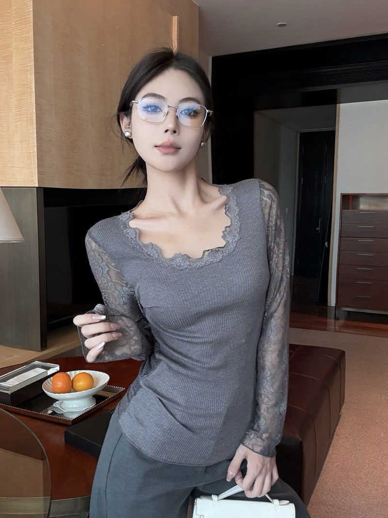 NA+ 不簡單打底蕾絲拼接針織上衣 灰