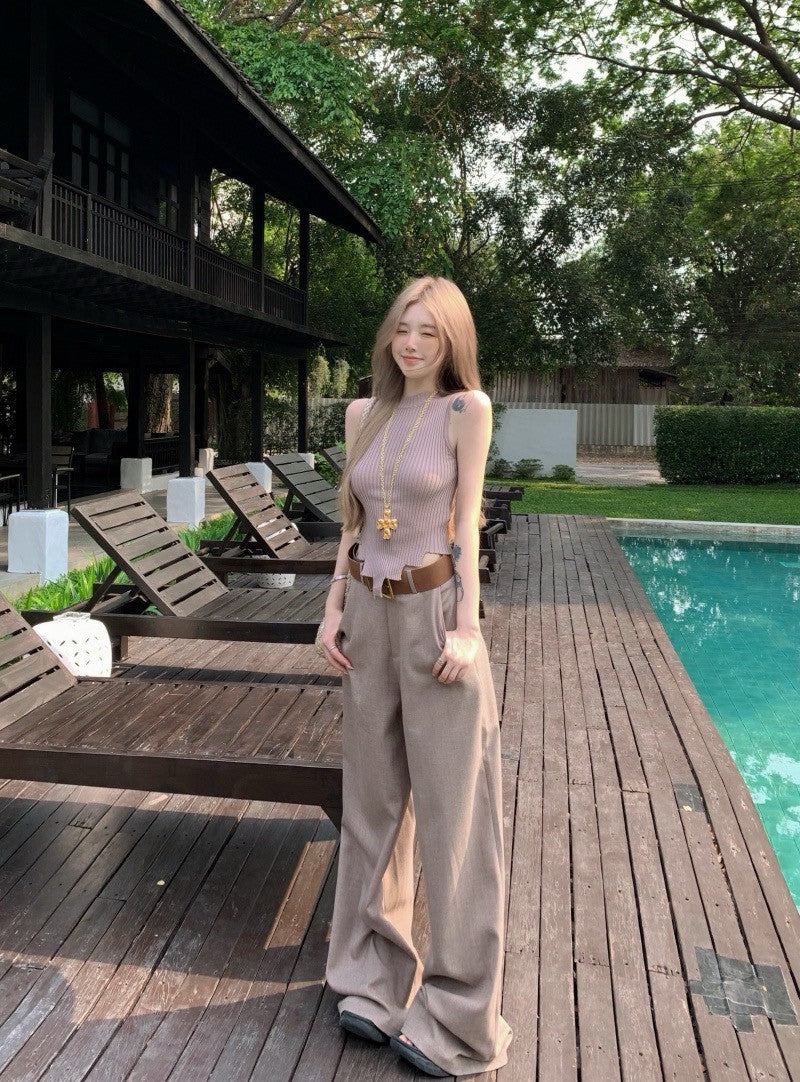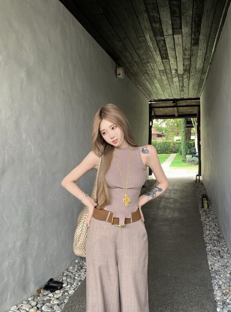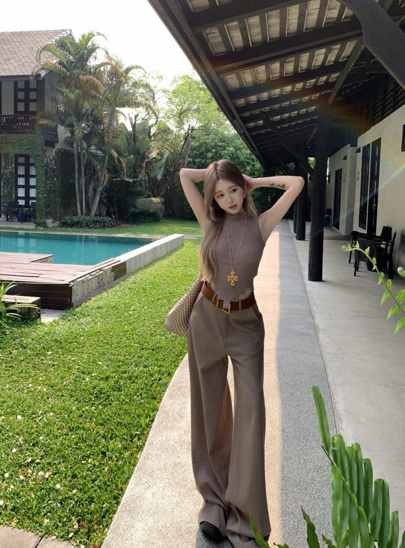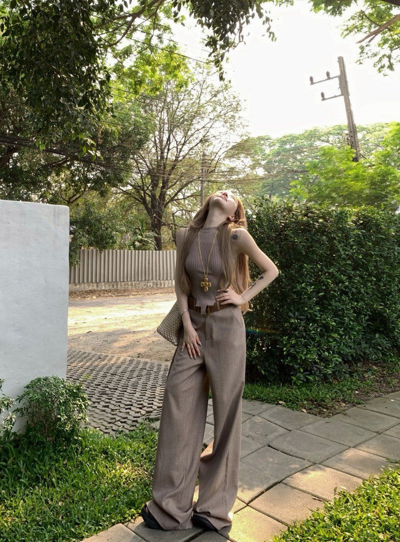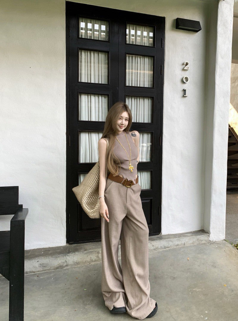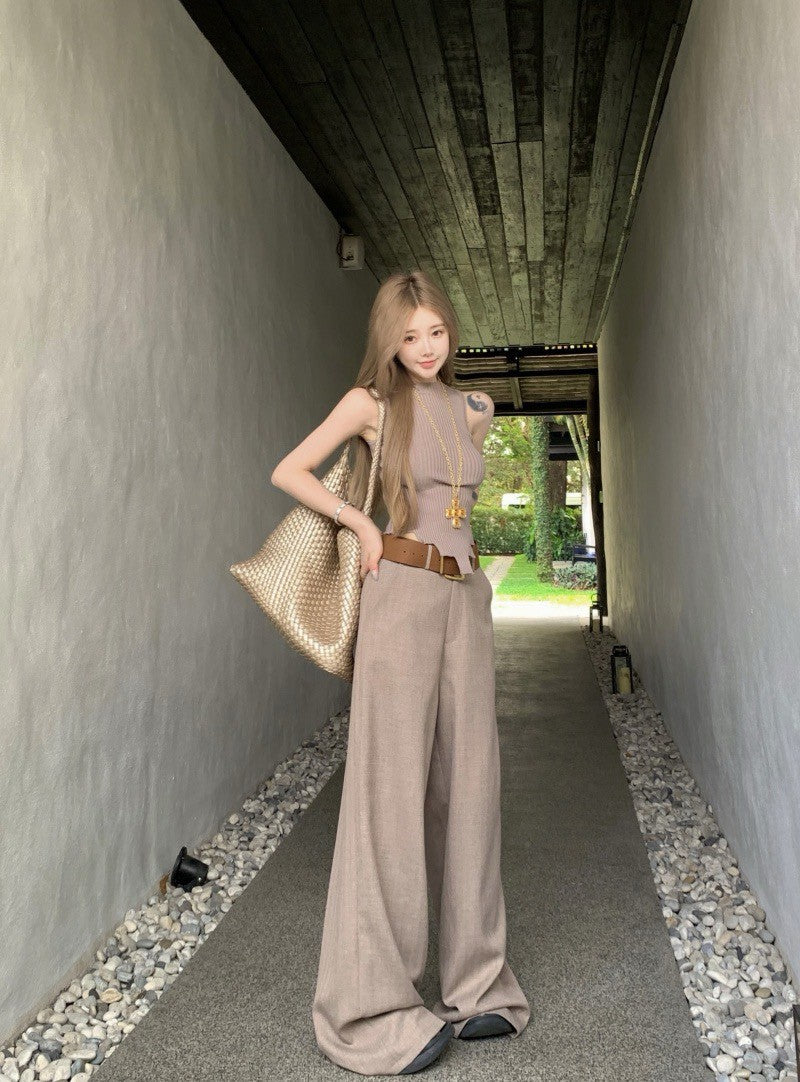 Na+ 不規則設計感針織背心 高腰通勤老錢休閒褲 卡其