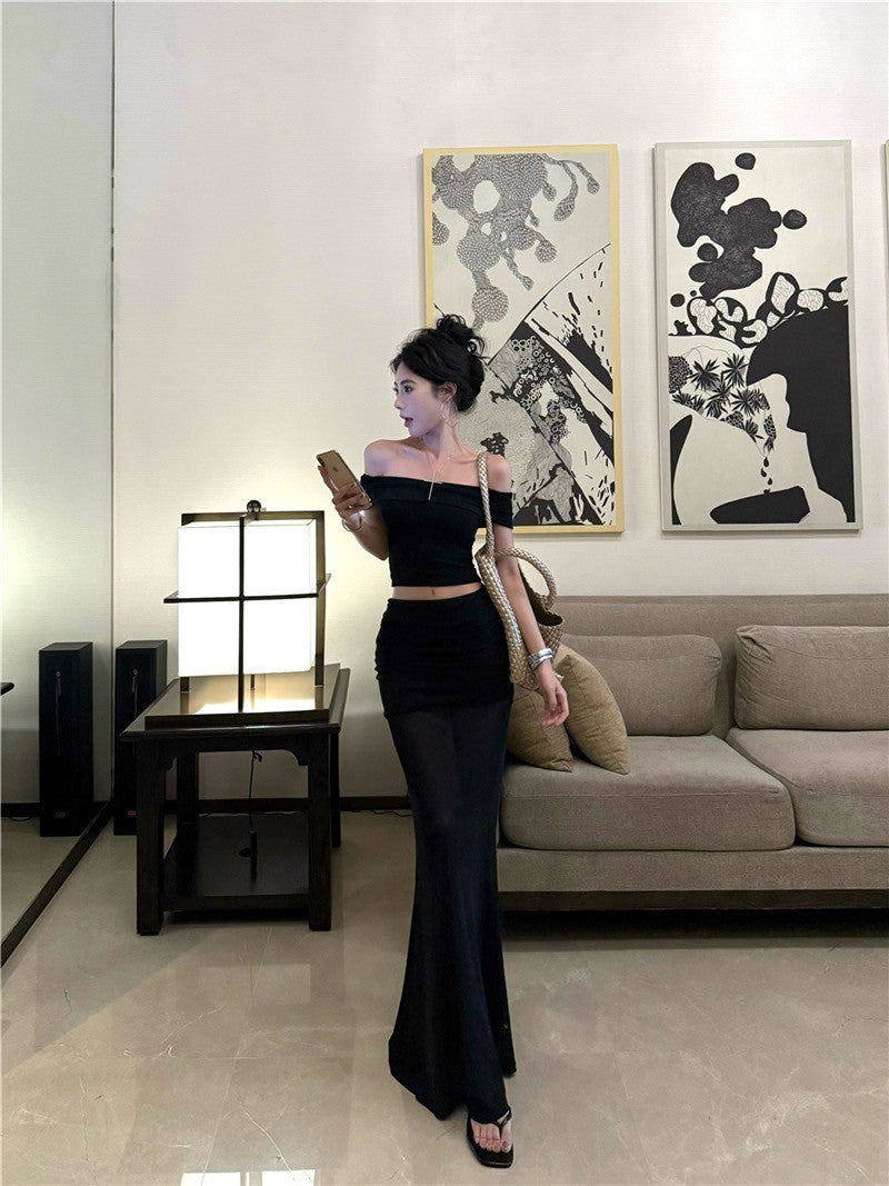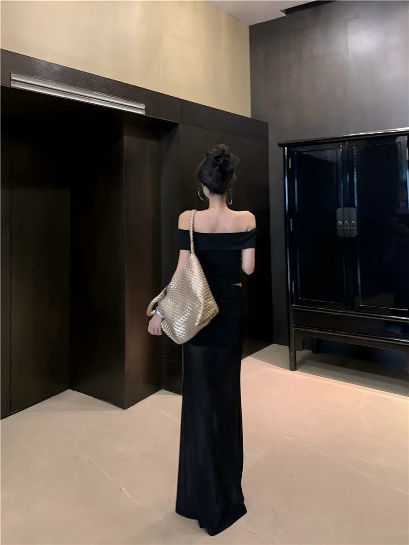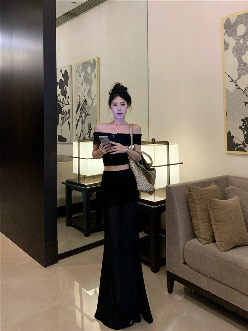 NA+ 主角光環一字領顯瘦上衣 網紗拼接裙 黑