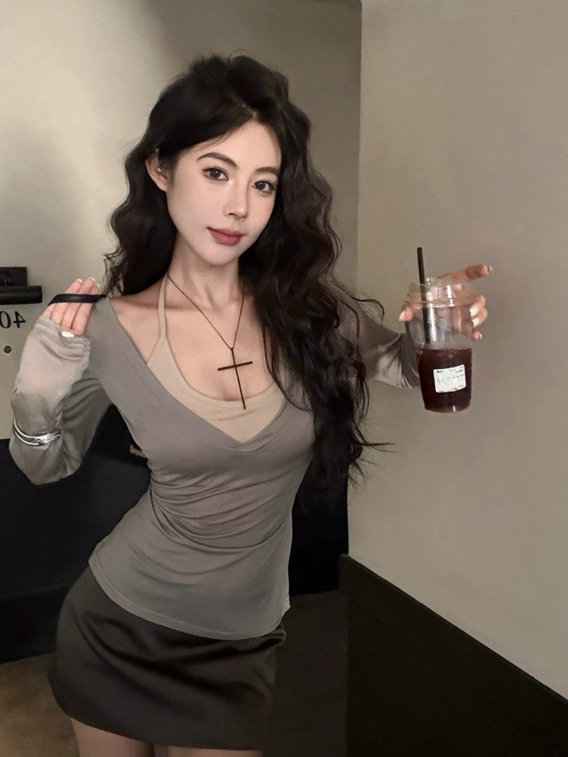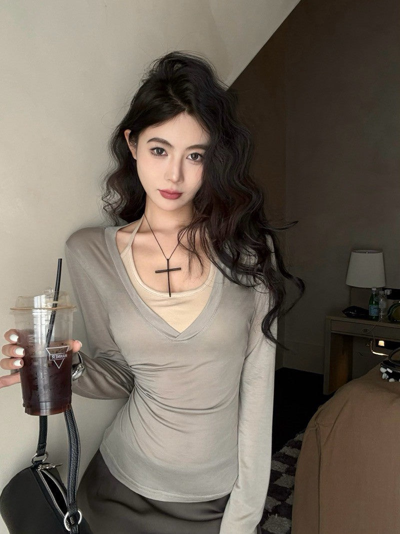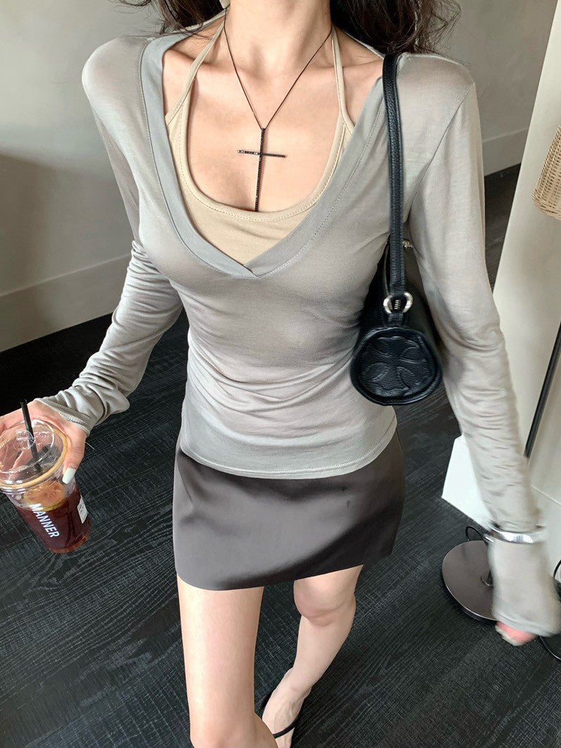Na+ 休閒百搭 冰肌天絲V領上衣 灰