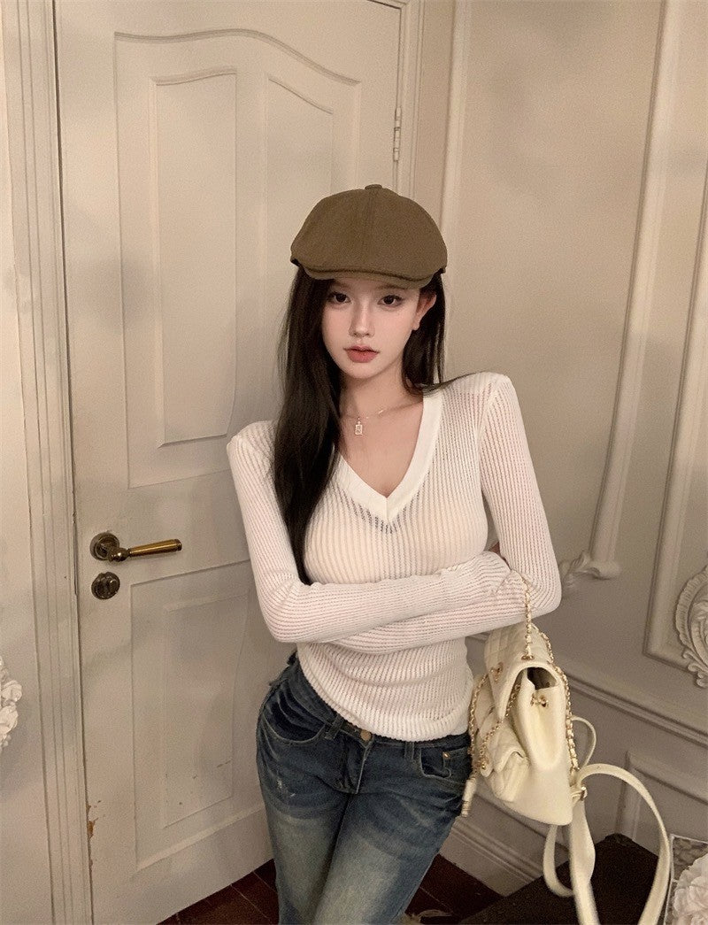 ''Na+''休閒百搭 V領網眼針織上衣 米/卡其 中腰半身裙