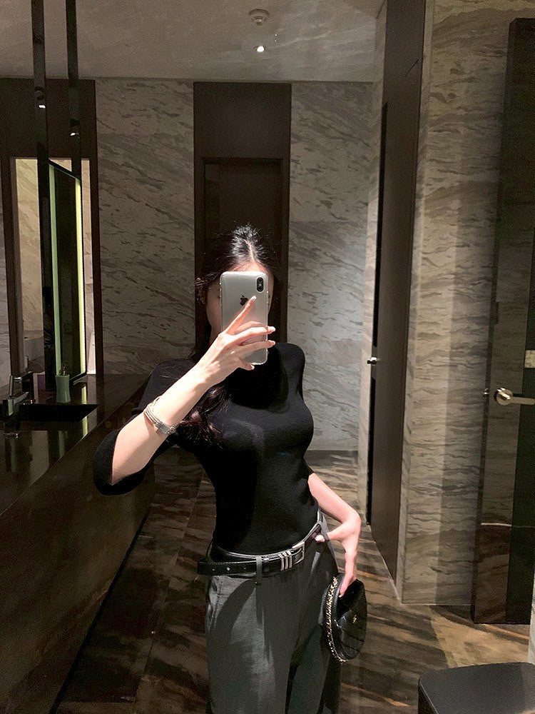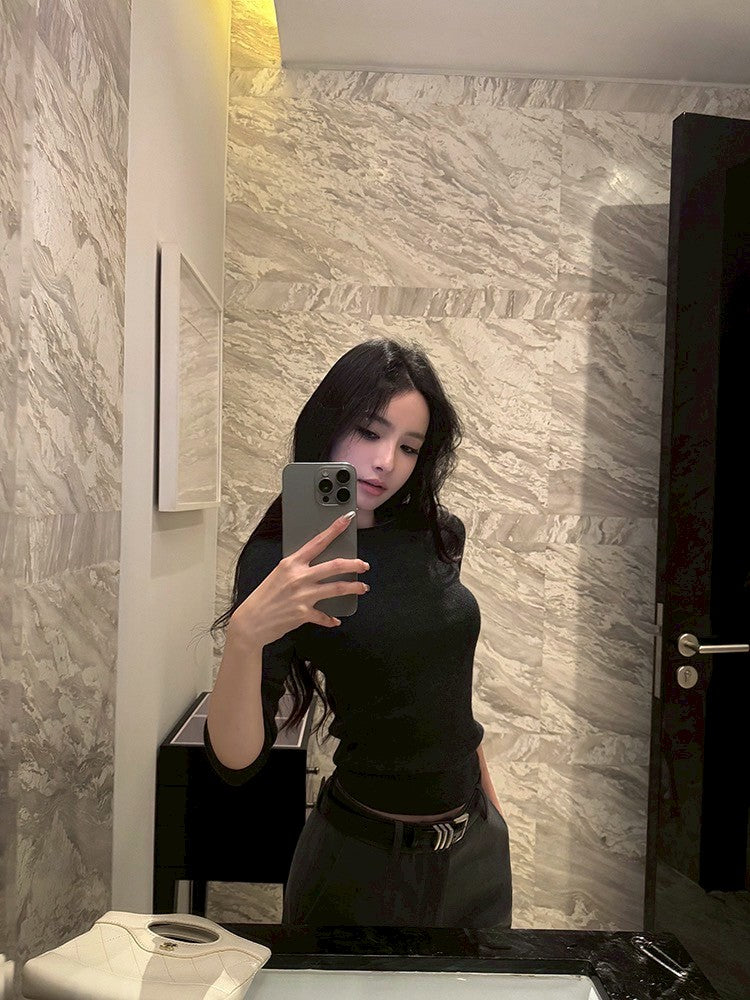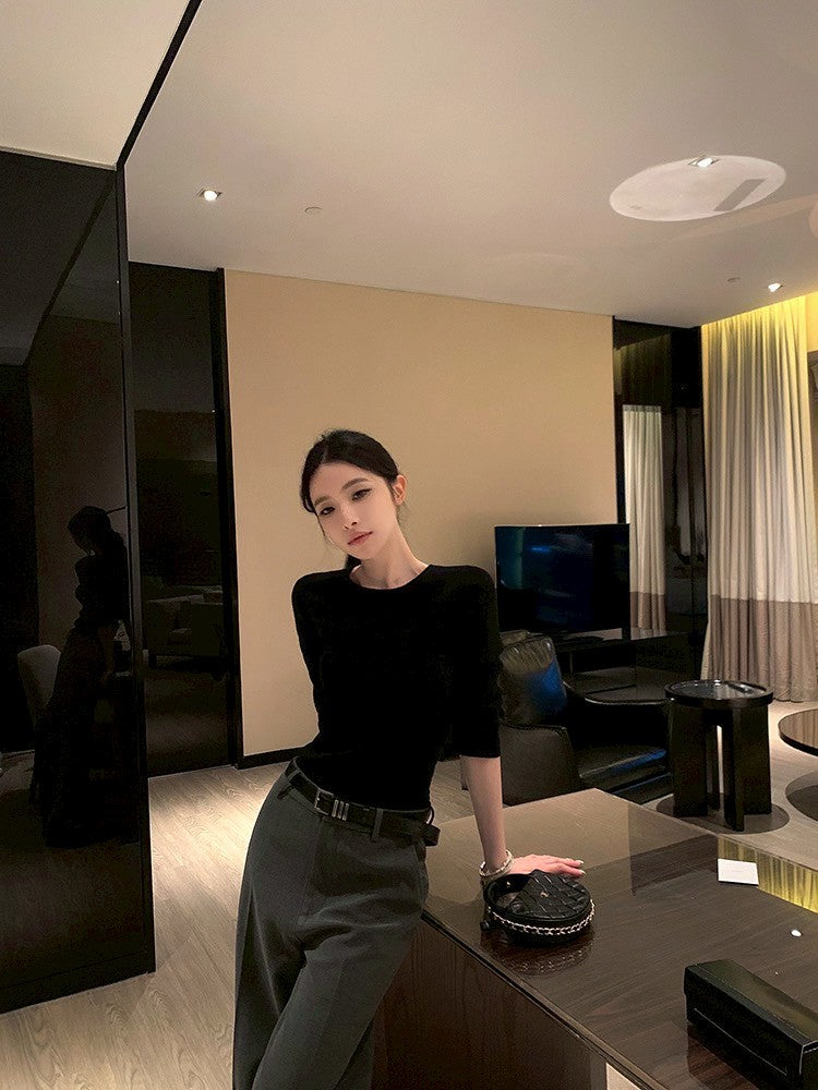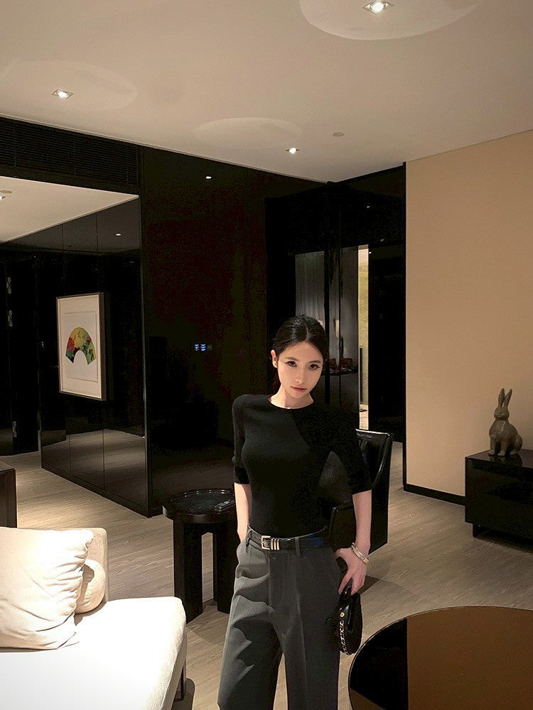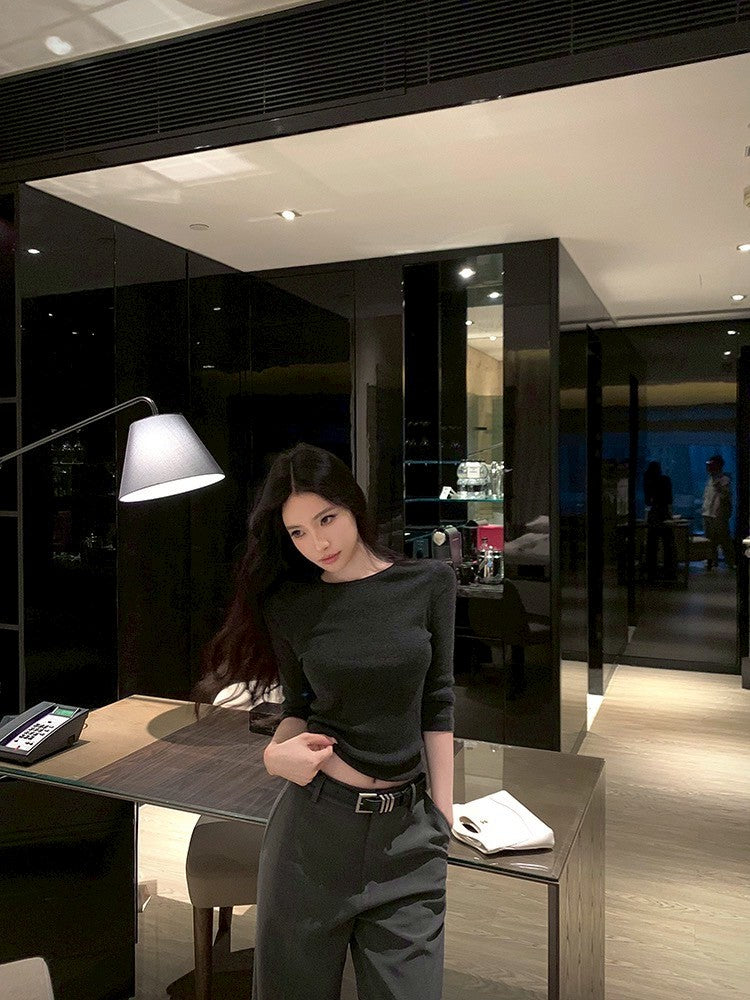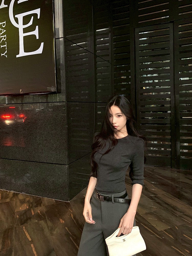 ''Na+''低調氛圍 5分袖修身針織上衣 灰/黑 中腰休閒褲