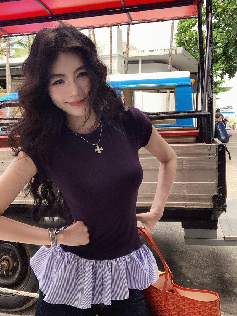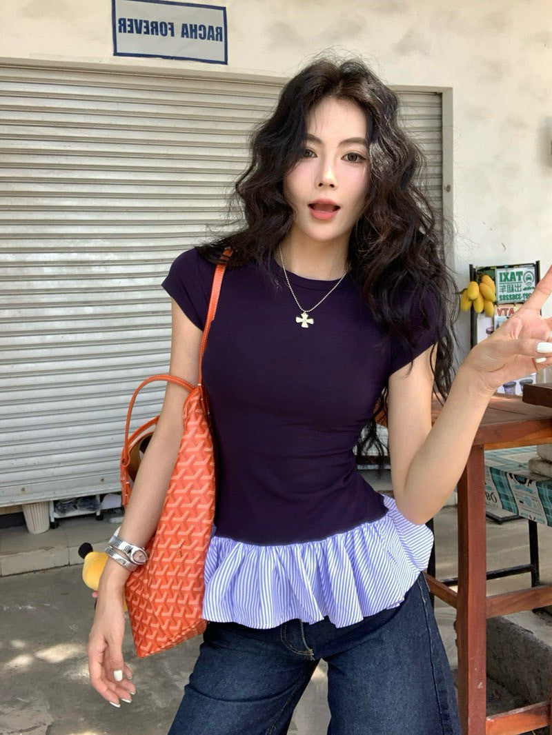 NA+ 俏皮荷葉拼接正肩上衣 灰/藏藍