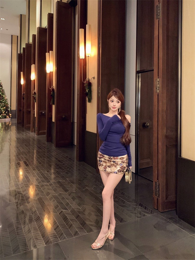 ''Na+''千禧辣妹 慵懶斜肩緊身上衣 復古半身裙
