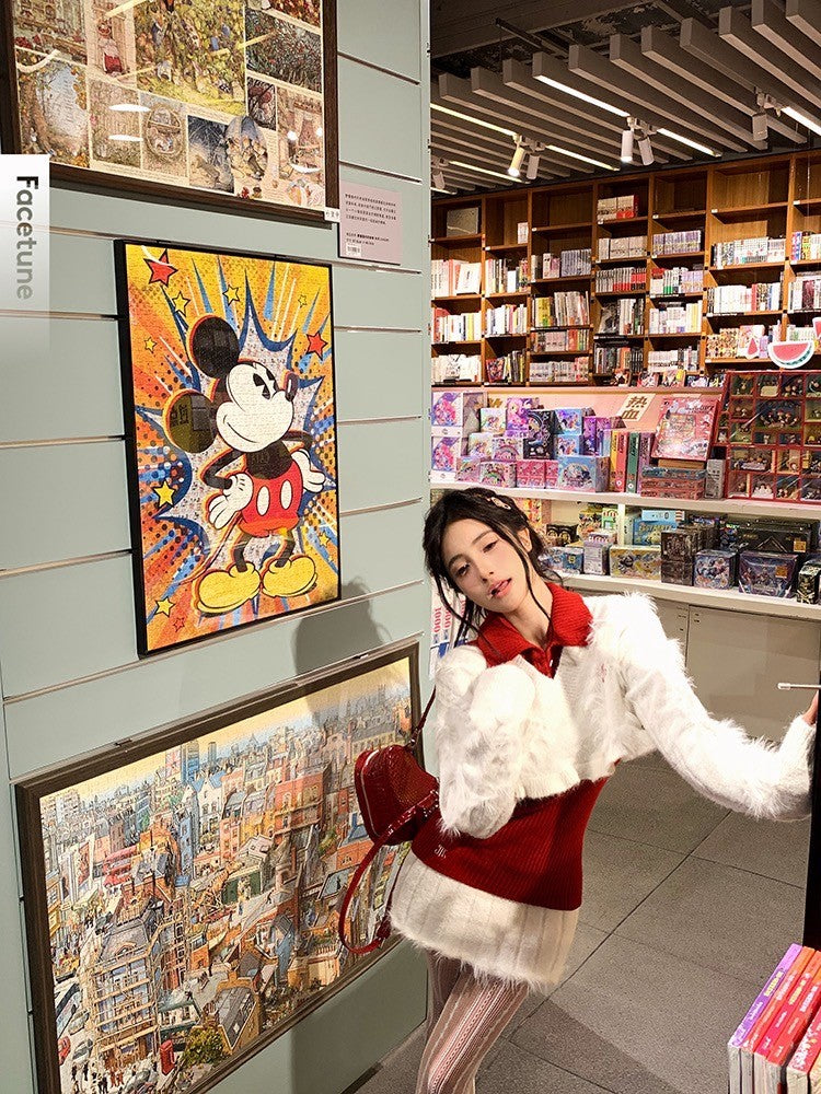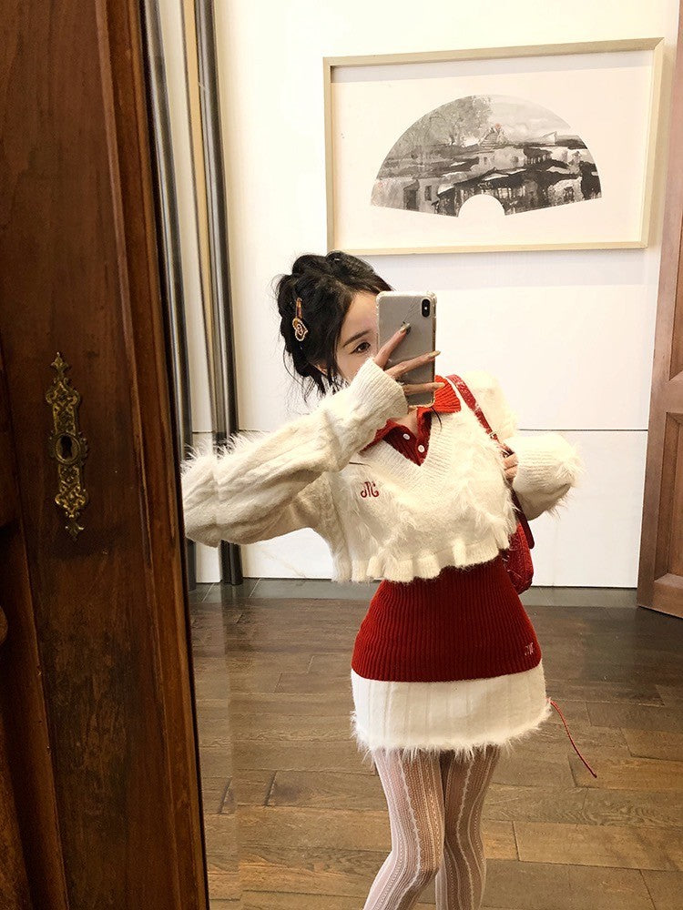 ''Na+''叛逆女高校 學院風短板水貂毛白上衣半身裙打底針織衫 紅