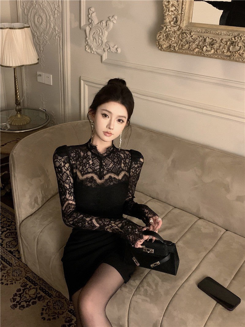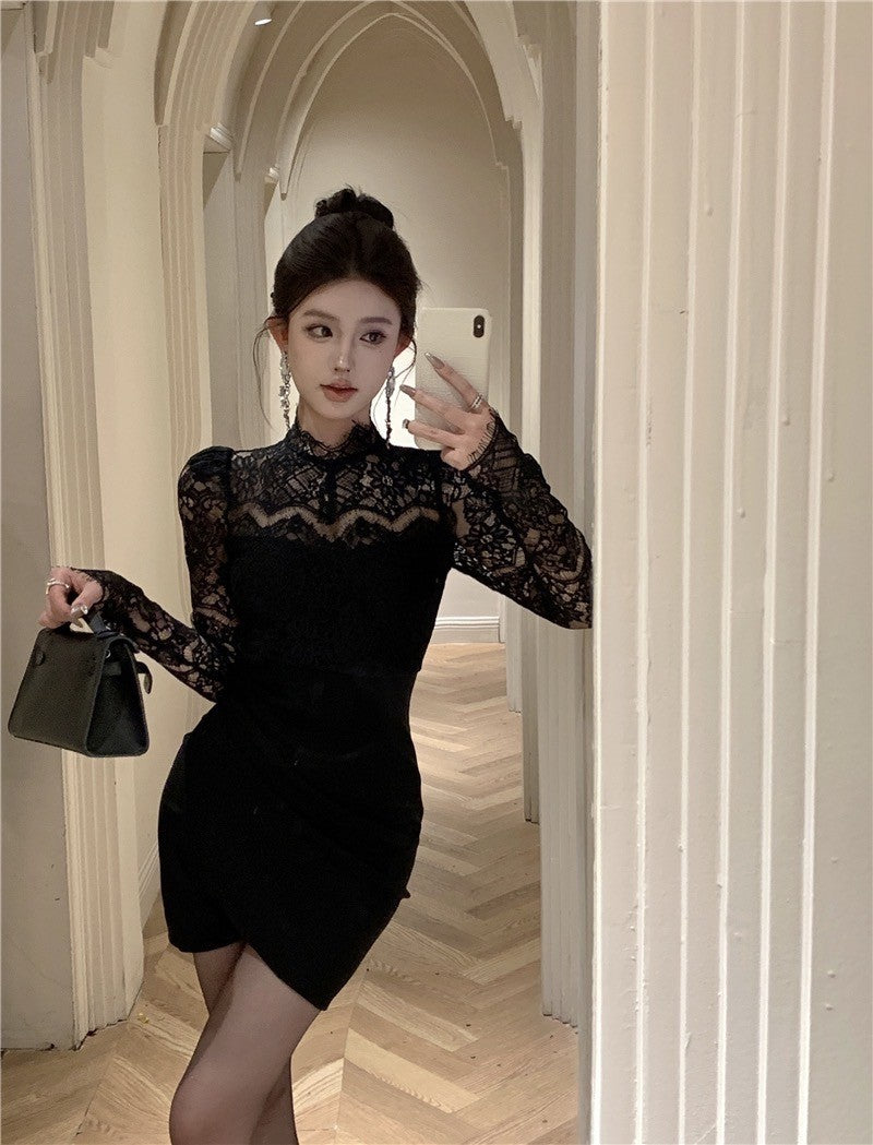 "Na+"古典晚宴會 蕾絲拼接半高領抓皺連身裙 黑