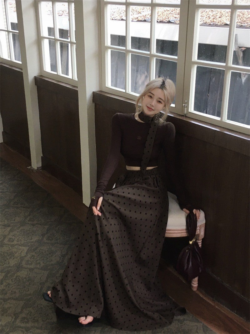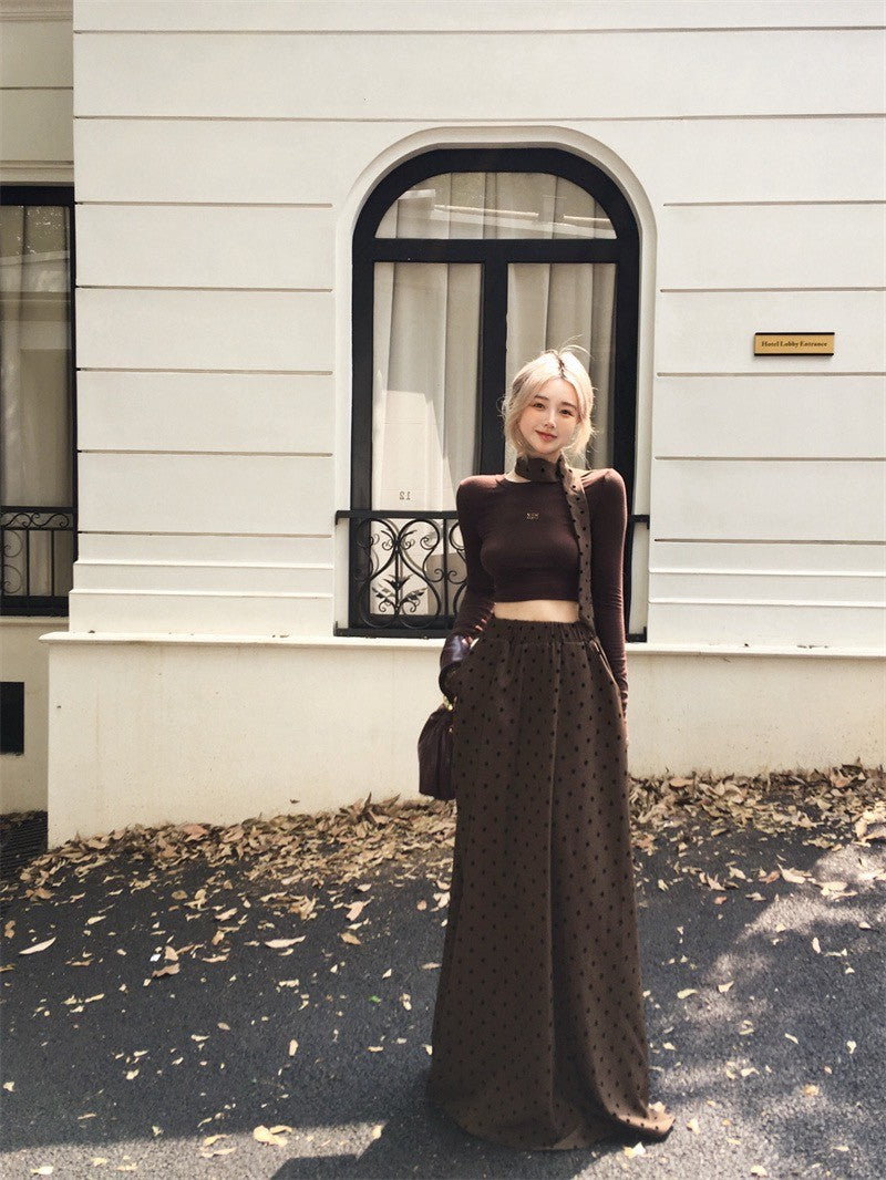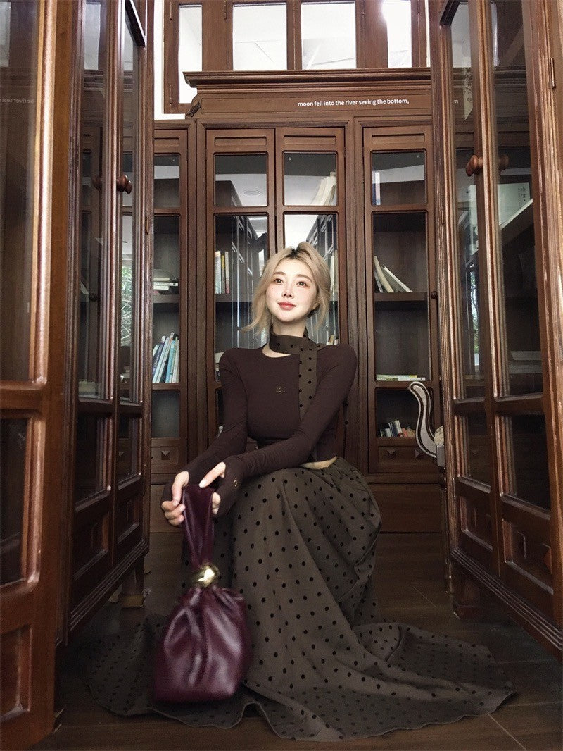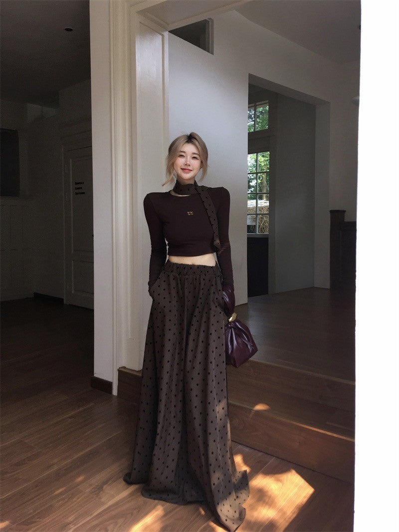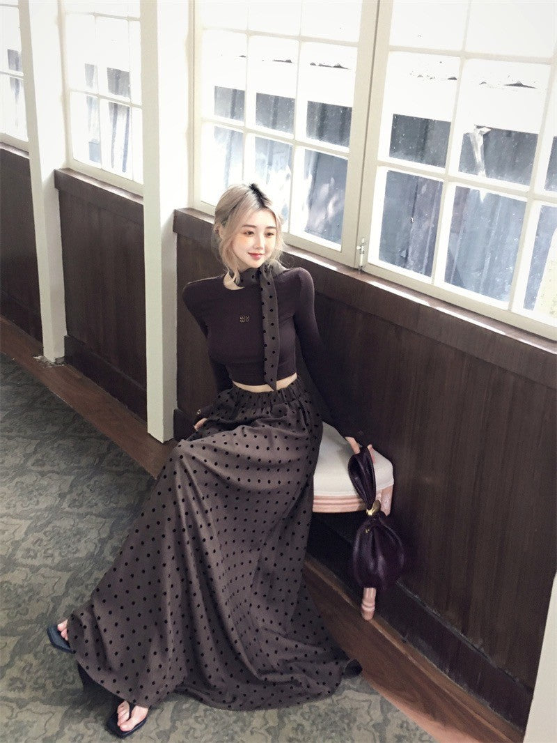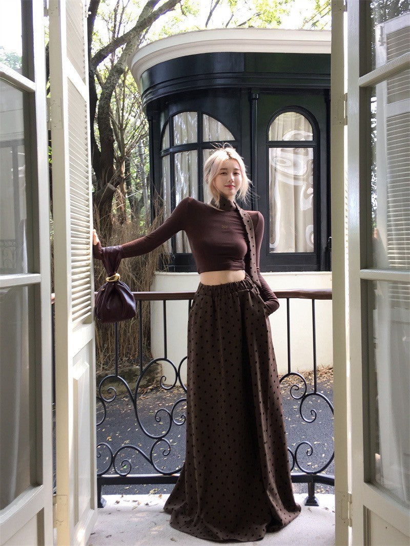 ''Na+''名貴老錢 燙鑽彈力短款咖色上衣 波點A字裙