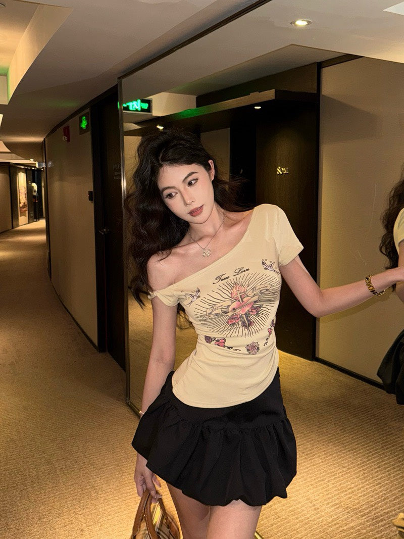 NA+ 嘻痞辣妹十字愛心印花不規則斜肩上衣 黑/卡其
