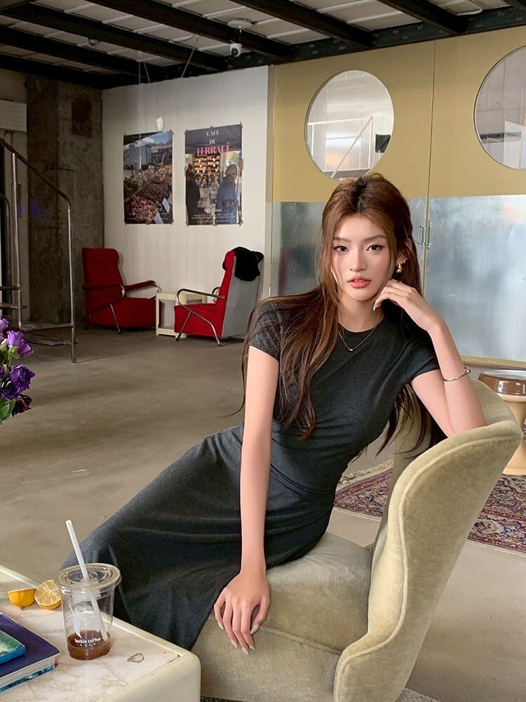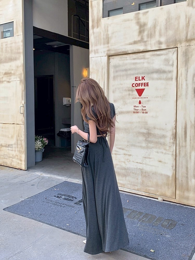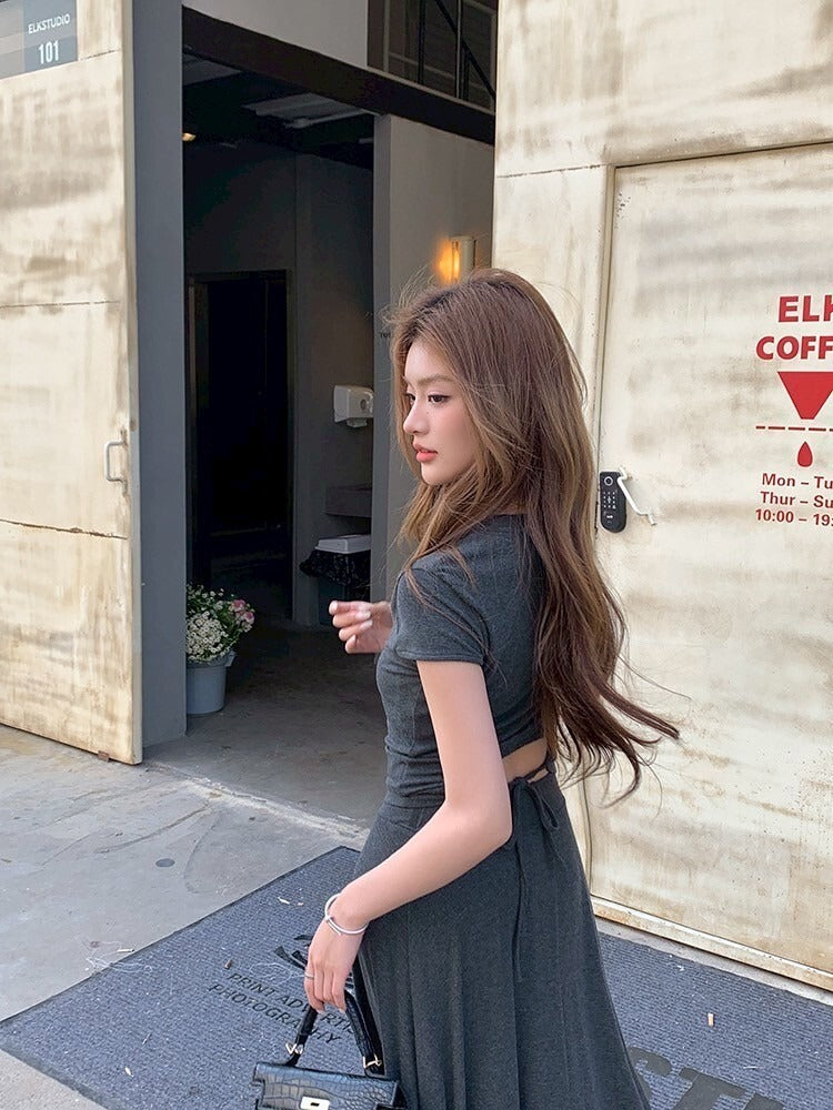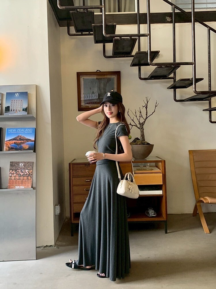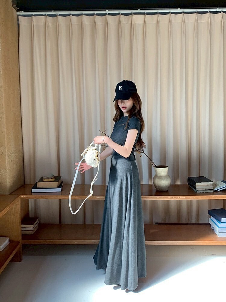 NA+ 基礎通勤 氣質圓領上衣半身裙套裝 灰