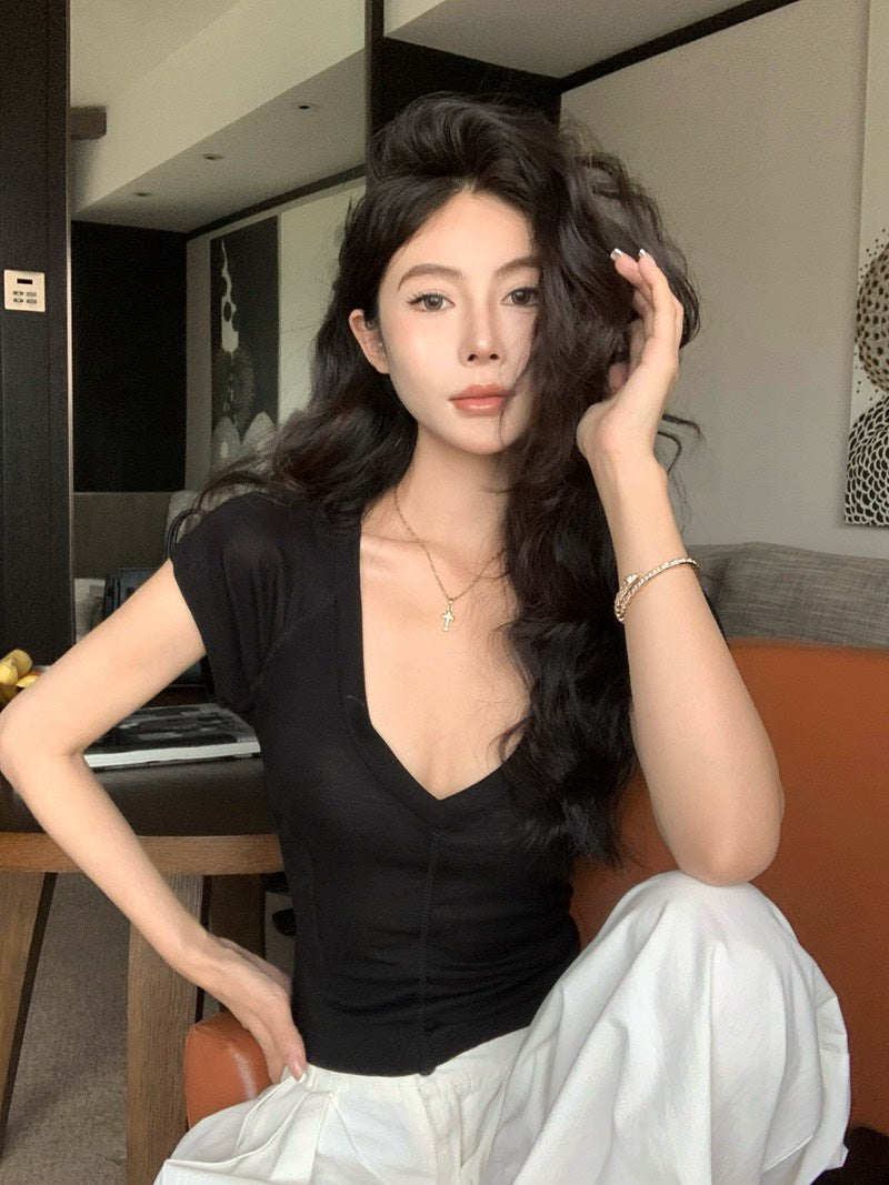 NA+ 好曲線仿魚骨微透視感V領上衣 白/黑