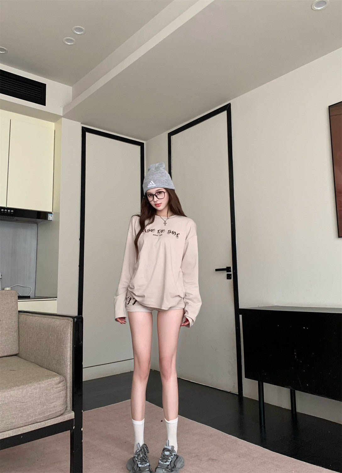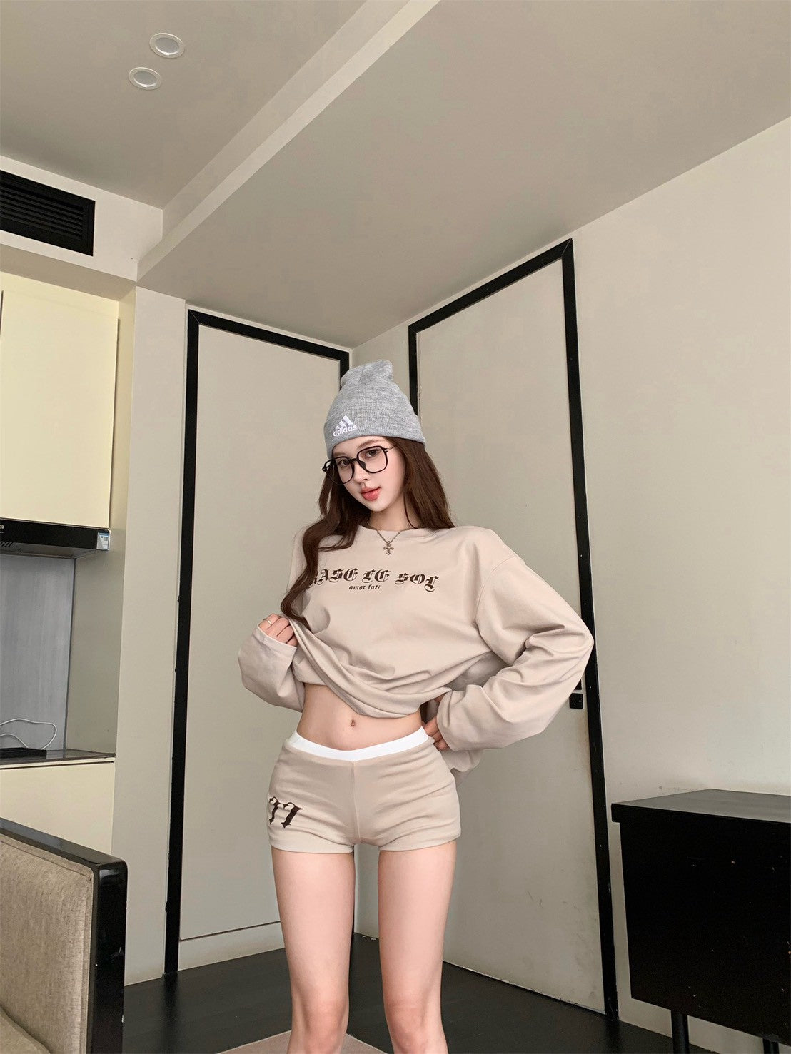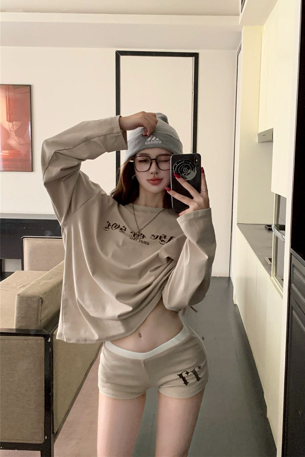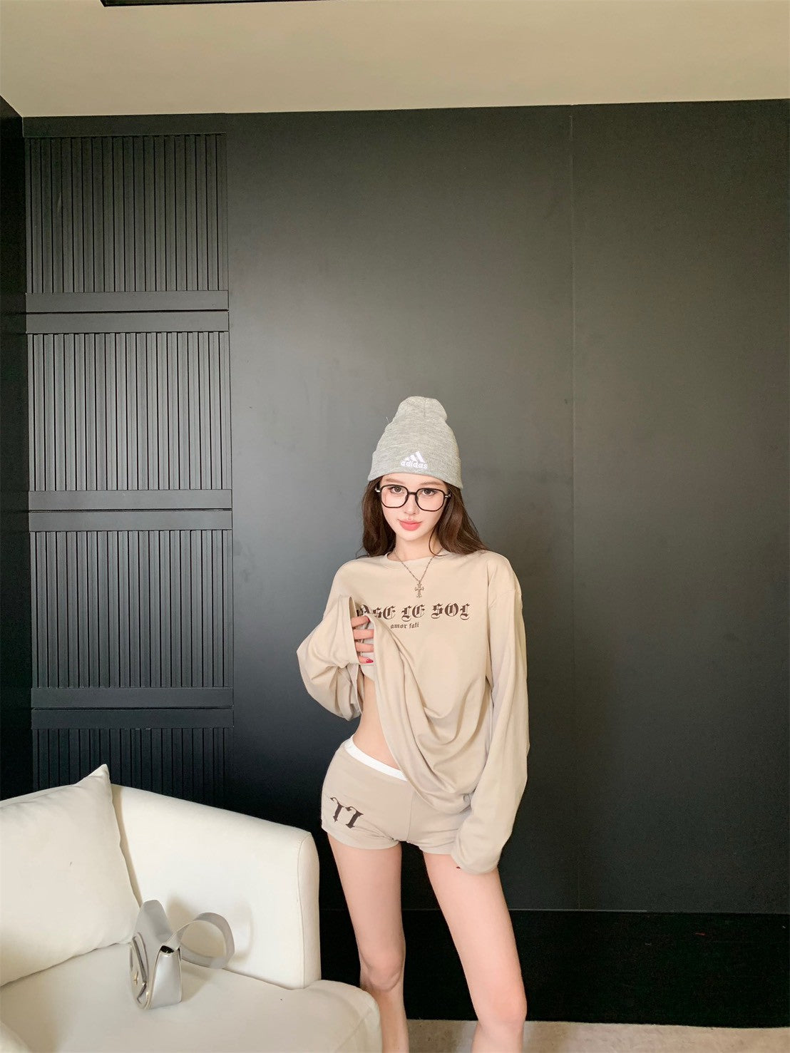 NA+ 居家Find out寬鬆字母上衣 拼接緊身短褲 奶茶色