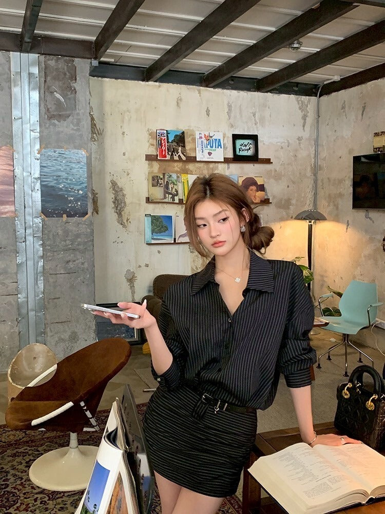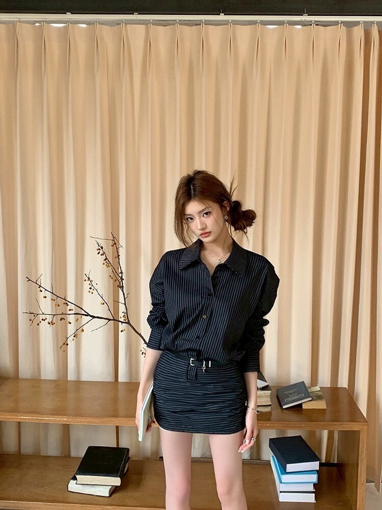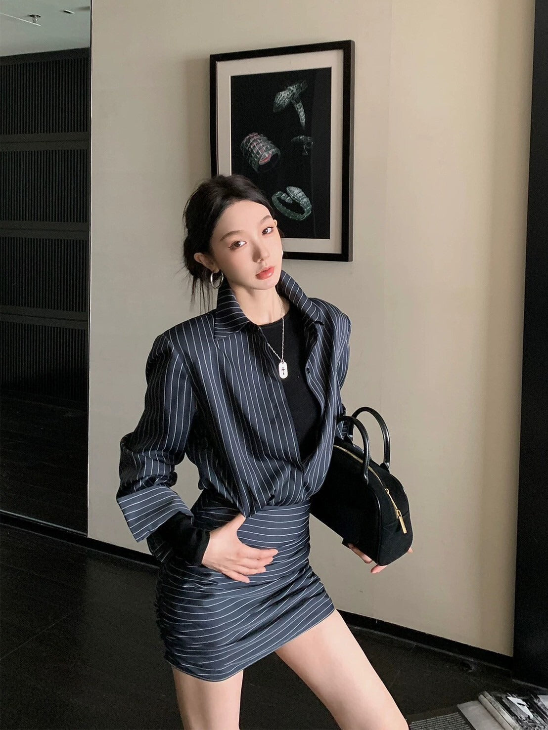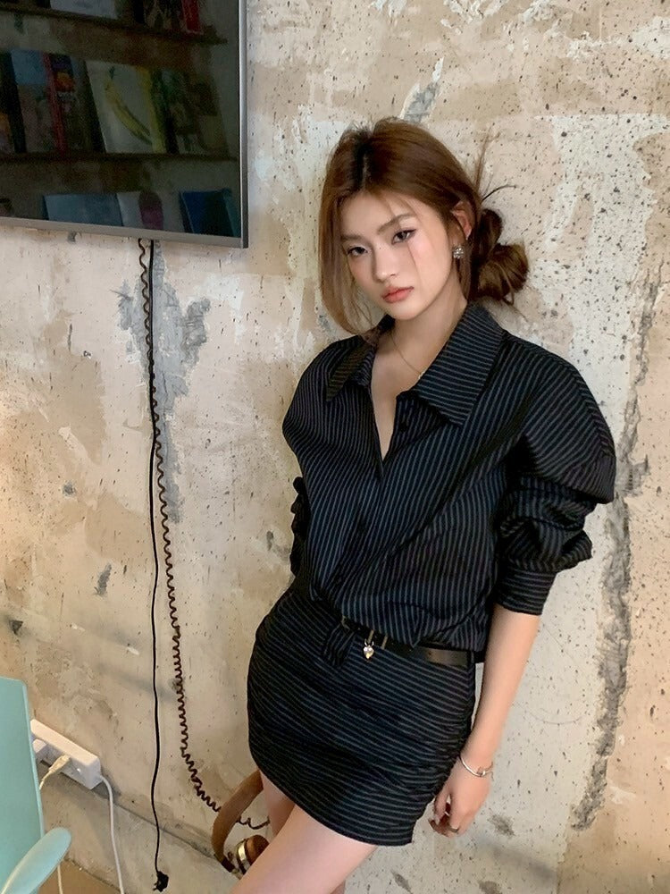 NA+ 御姐首選 復古條紋收腰襯衫包臀裙