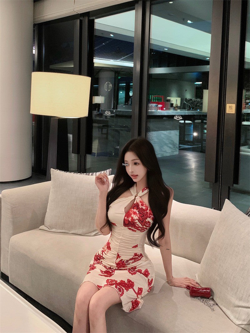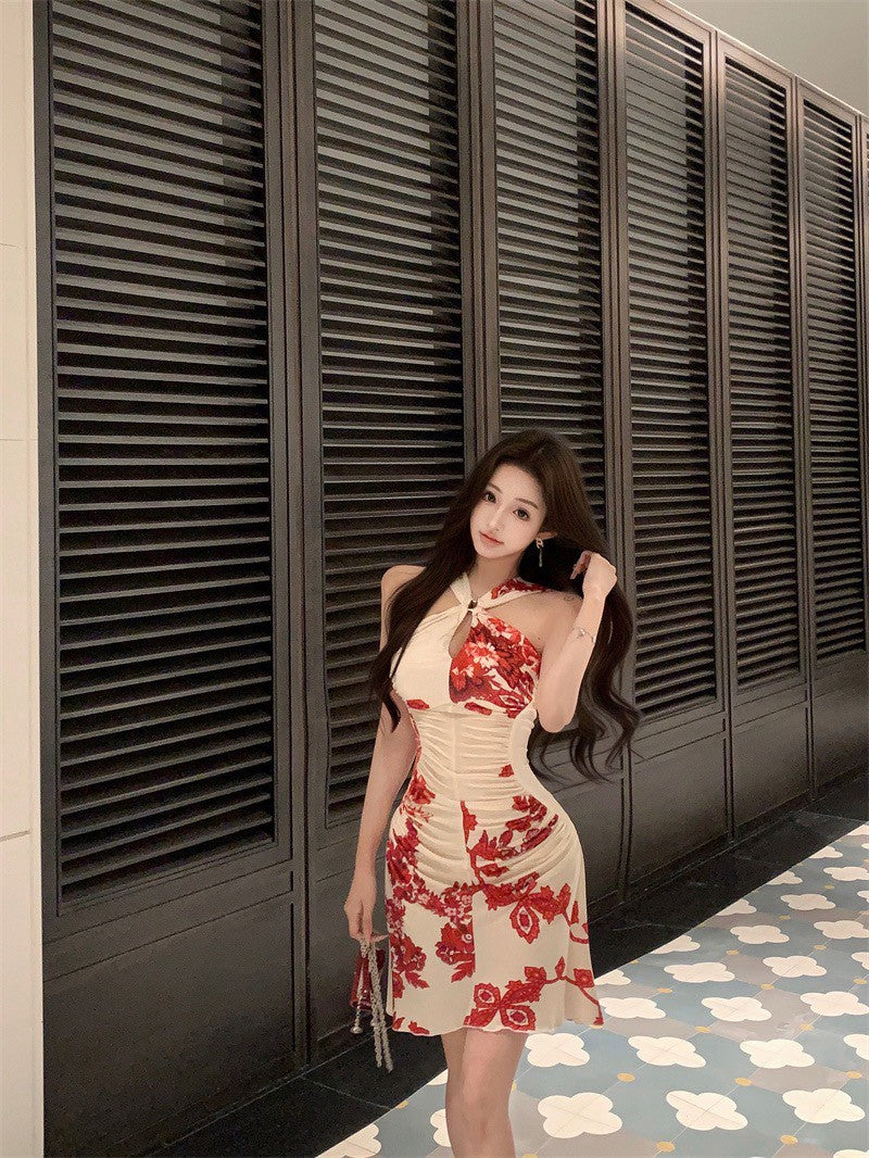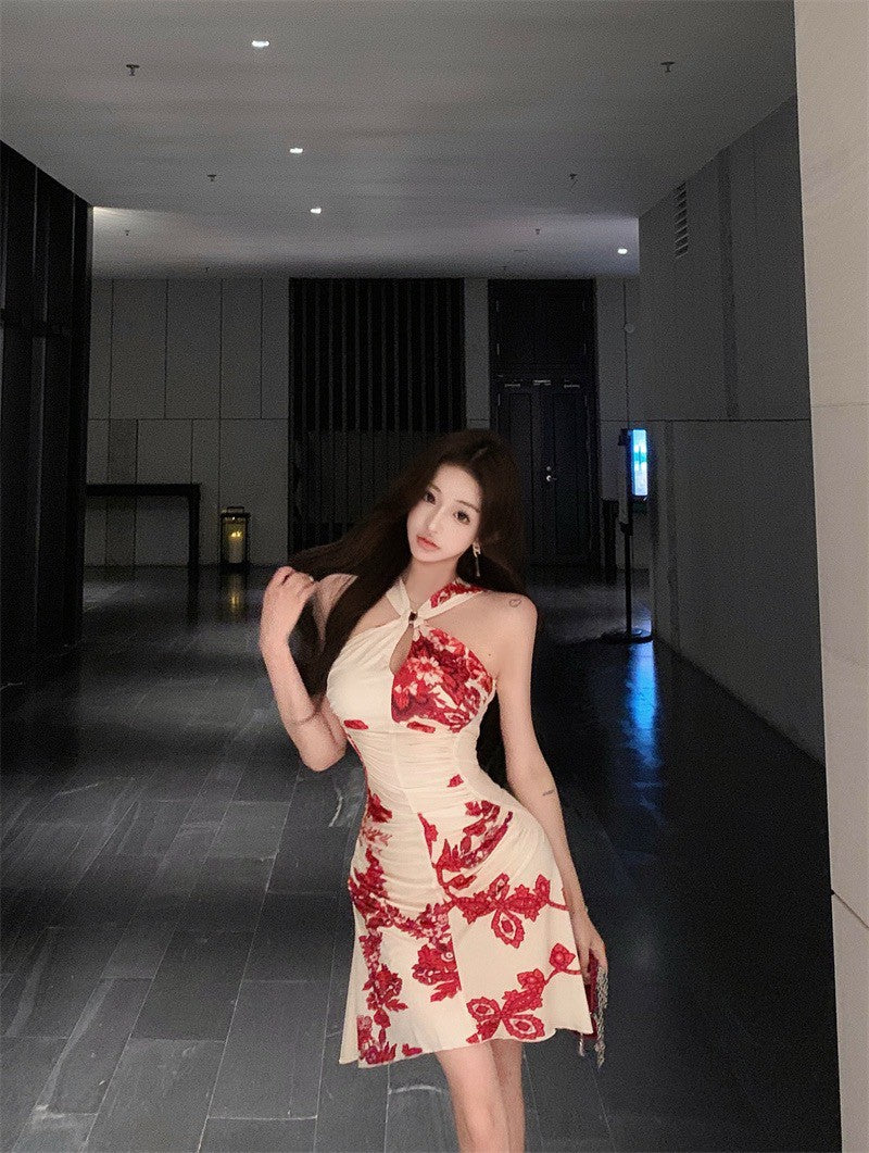 Na+ 復古名媛 中式設計感印花掛脖連身裙