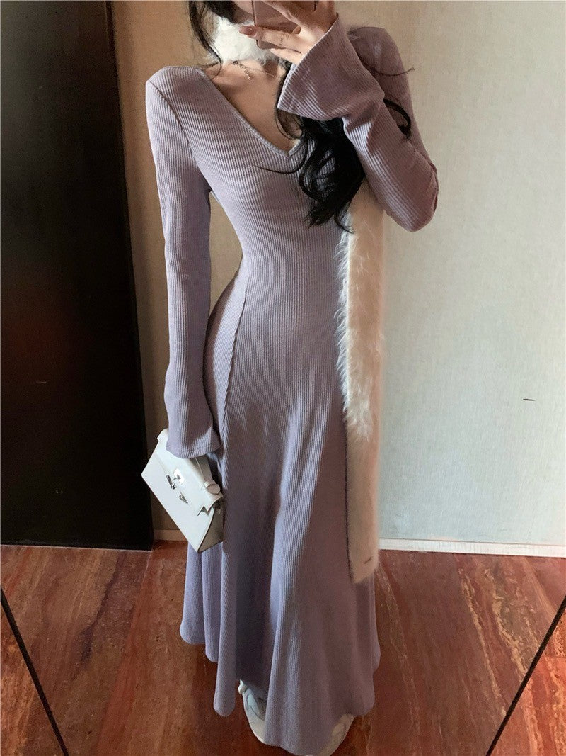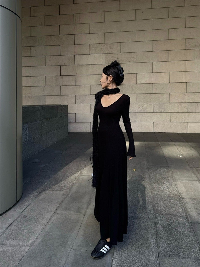 ''Na+''復古女伶一件可出門 V領魚尾裙擺連身裙 黑/淺紫