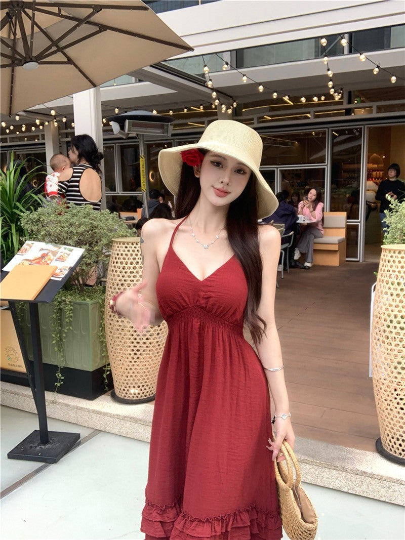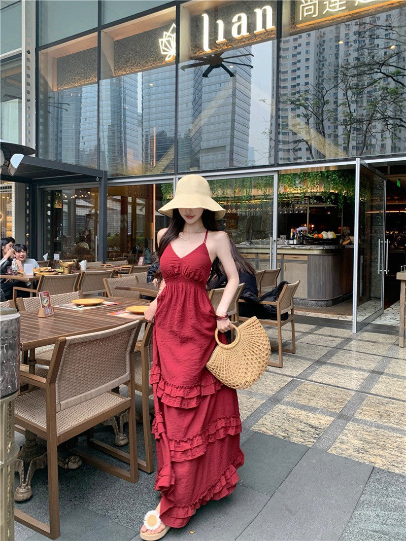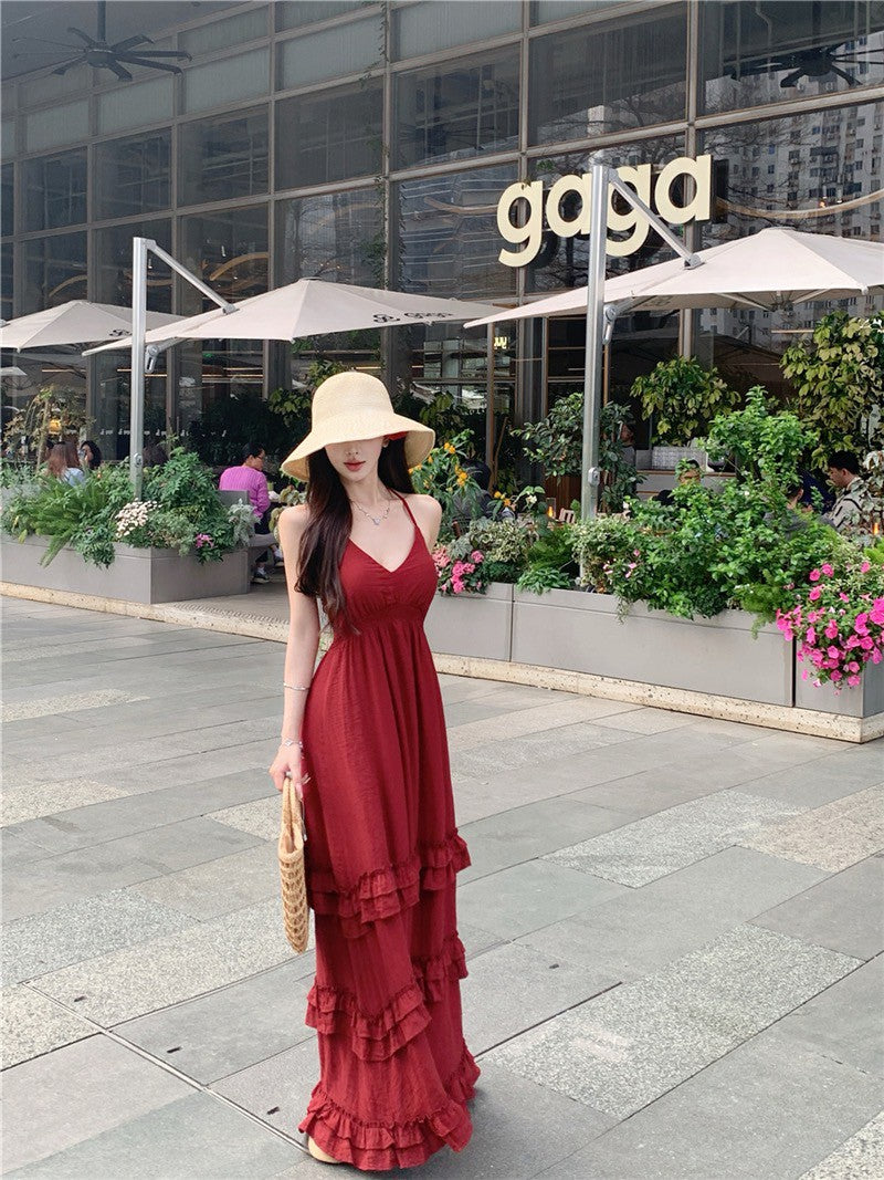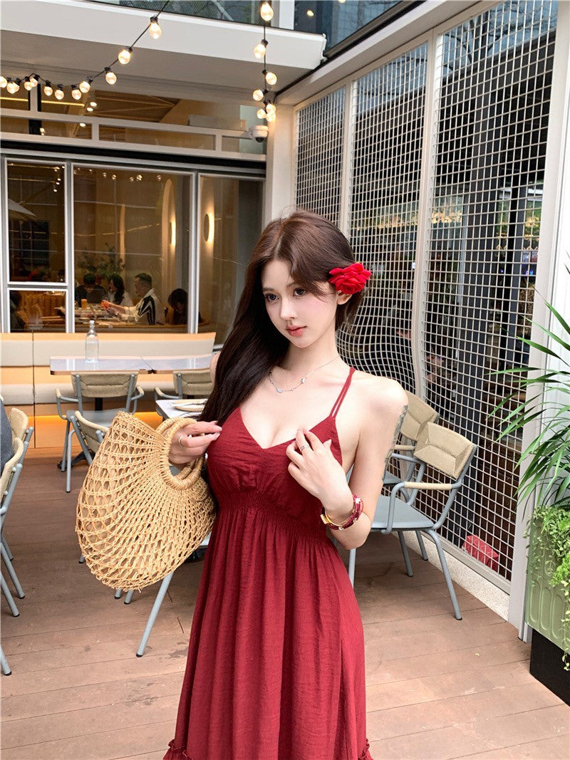 Na+復古度假V領收腰垂墜顯瘦洋裝 酒紅