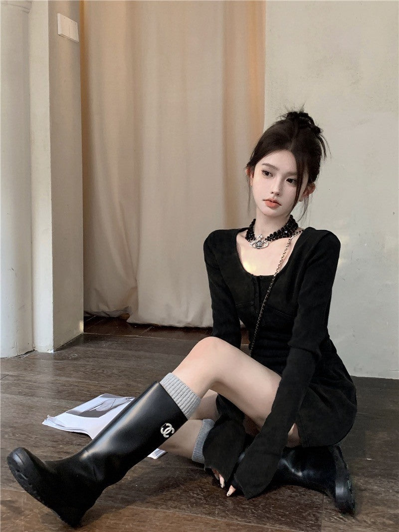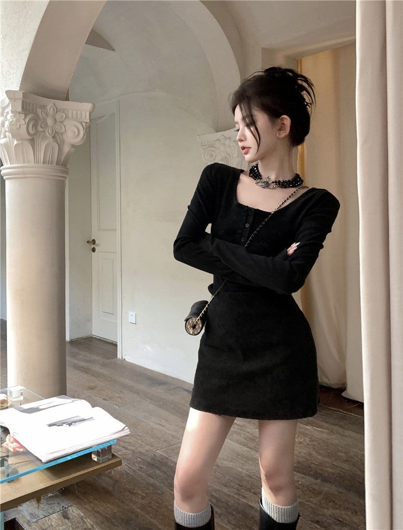"Na+"復古甜辣 方領修身顯瘦長袖連身裙 短款
