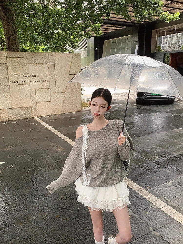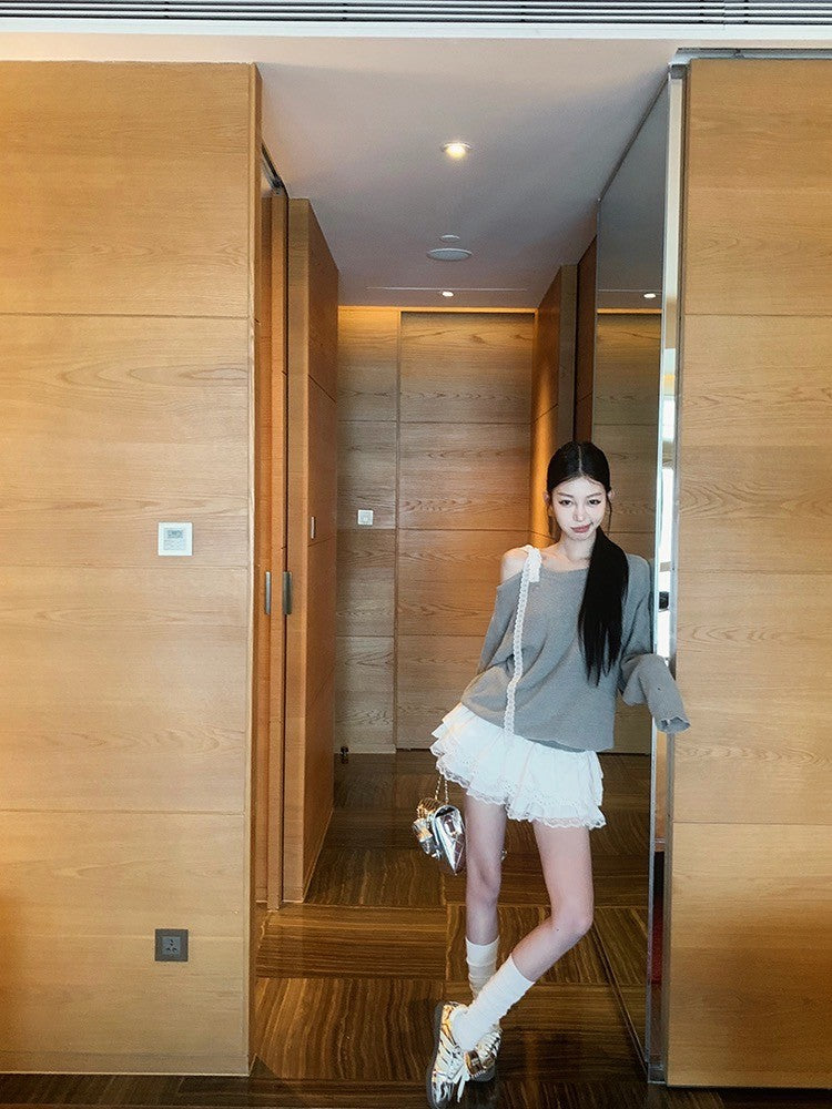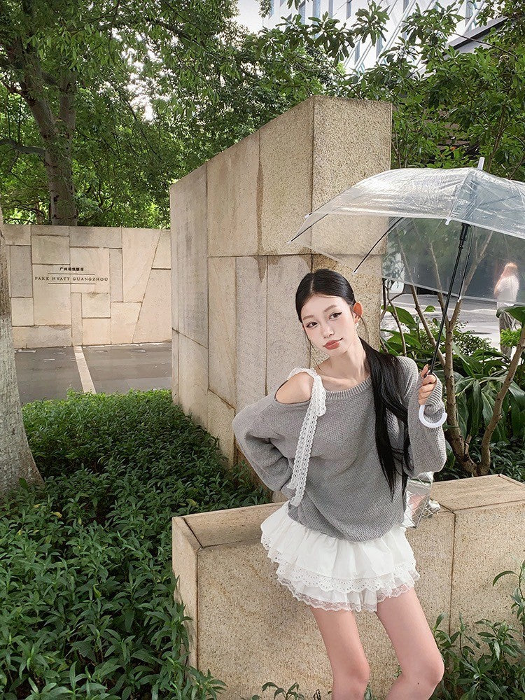 ''Na+''心動突擊 韓系蕾絲拼接蛋糕裙針織兩穿上衣 灰