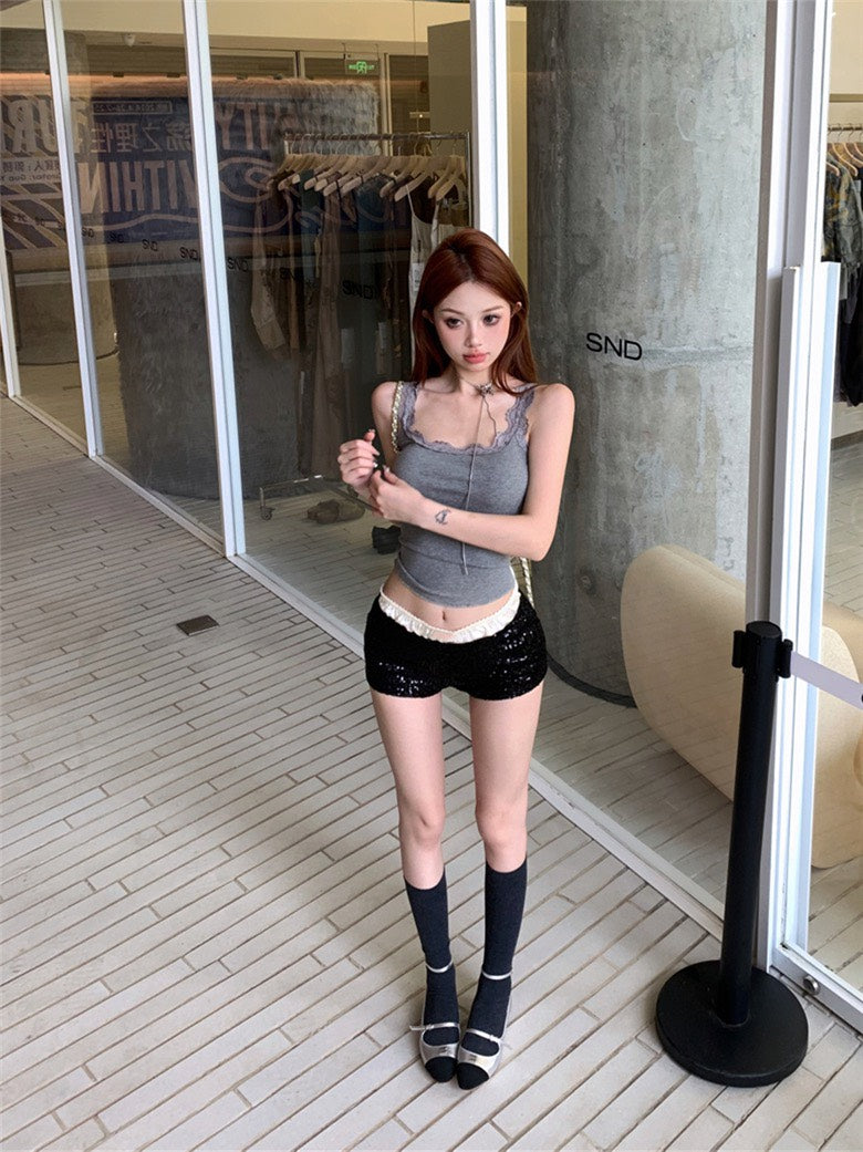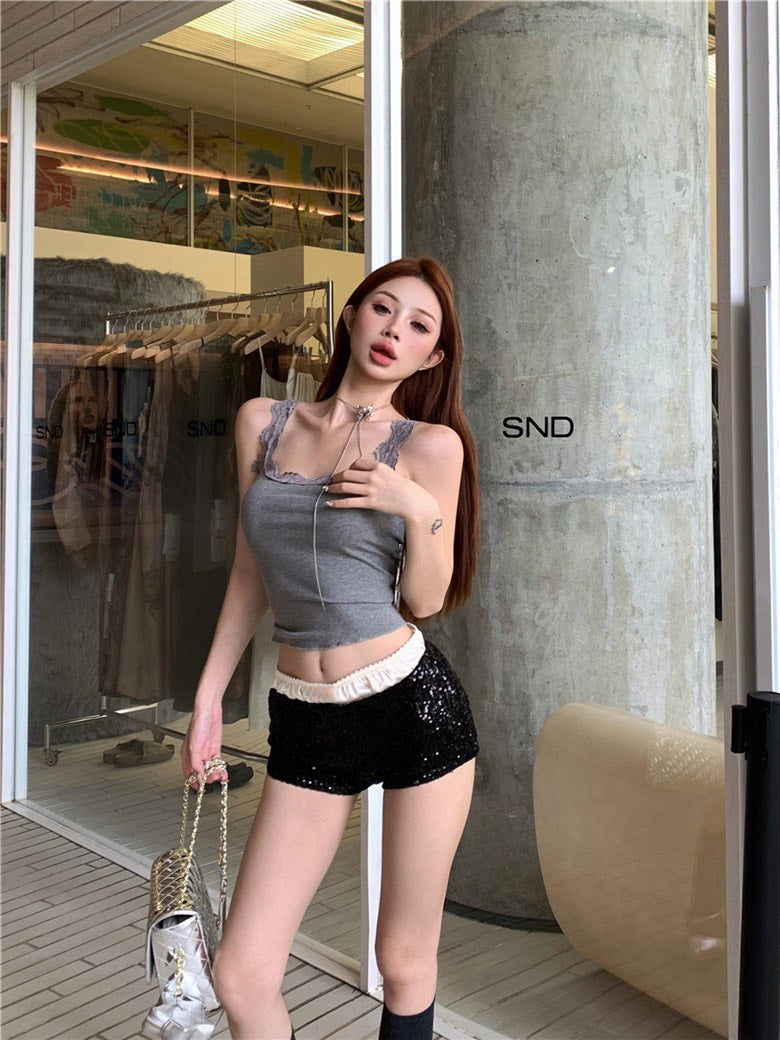 NA+ 性感小野貓 亞歷山大疊穿亮片短褲(緞面褲另搭)/ 灰色背心