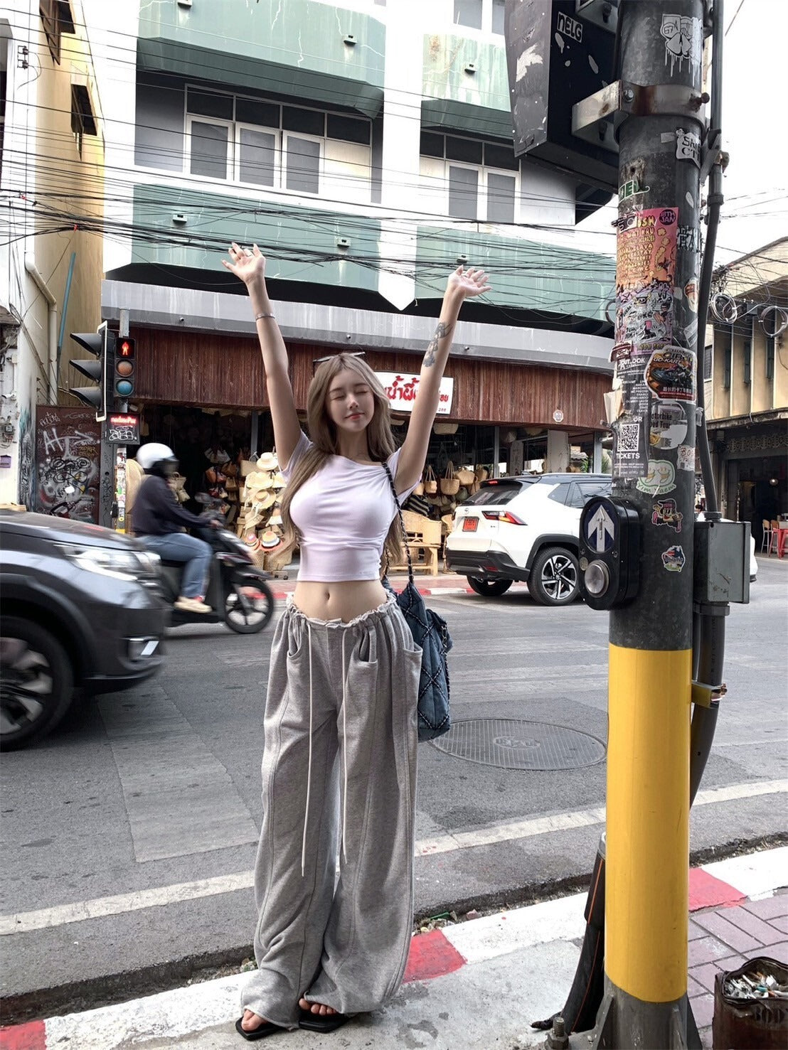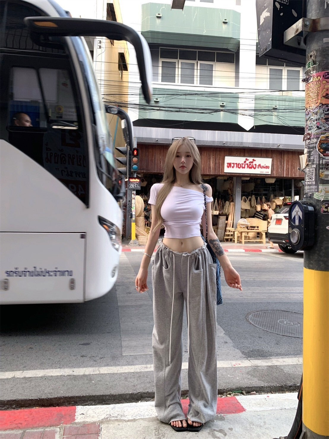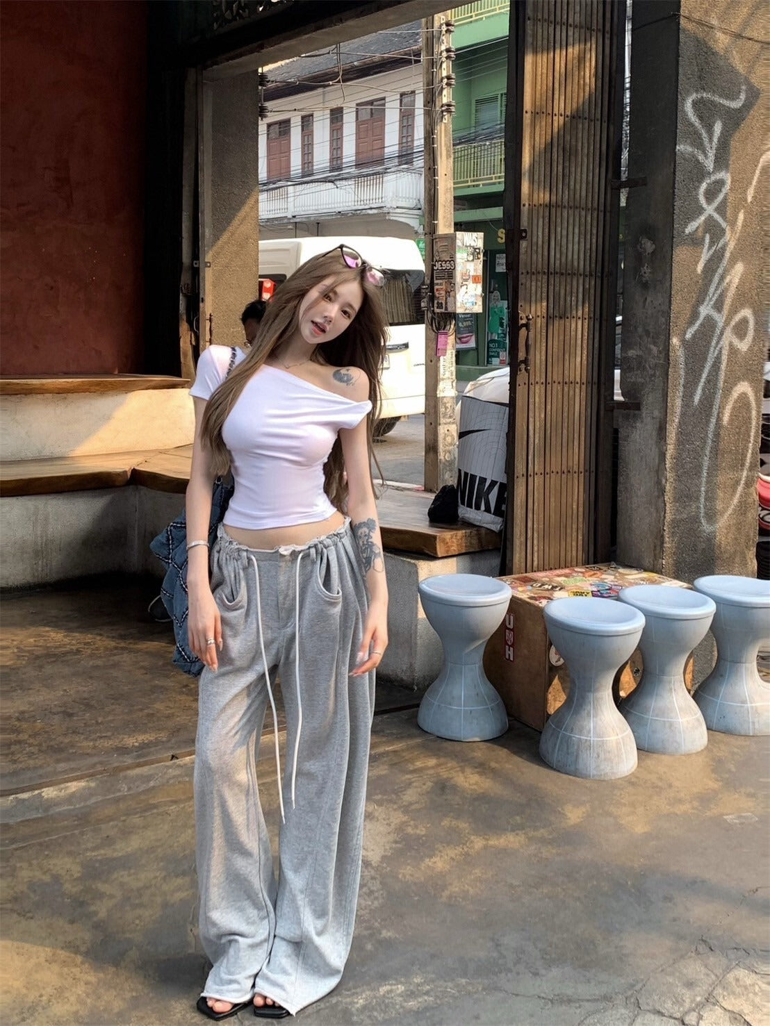 NA+ 想要每天穿 休閒顯瘦斜領上衣/灰色抽繩垂垂褲
