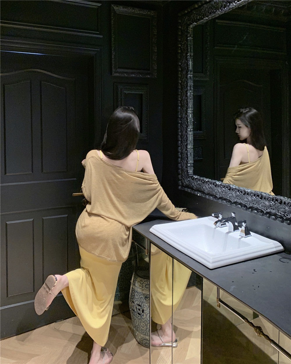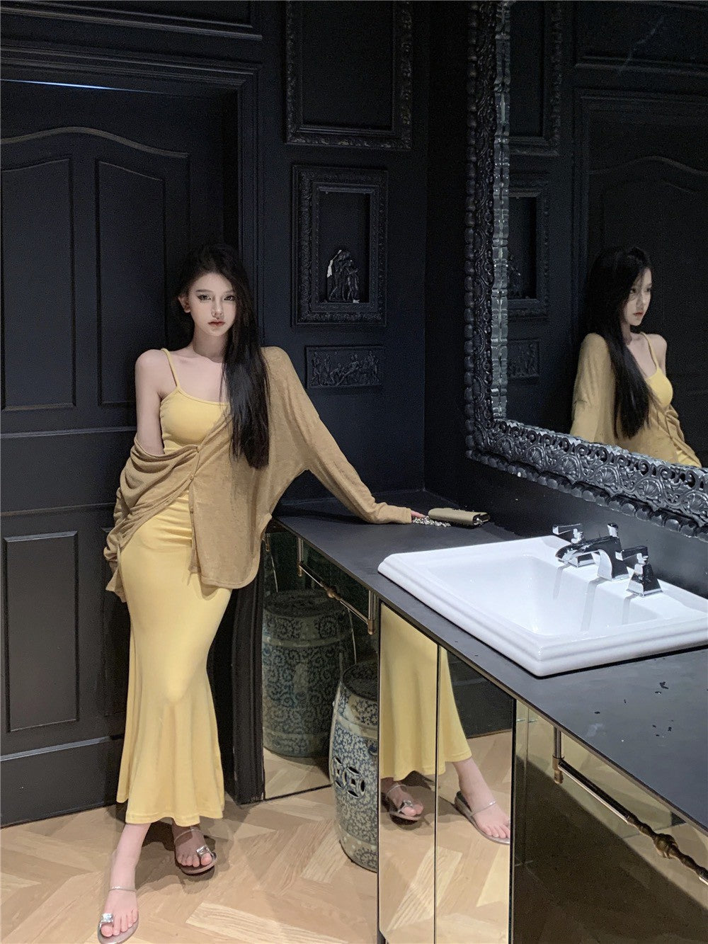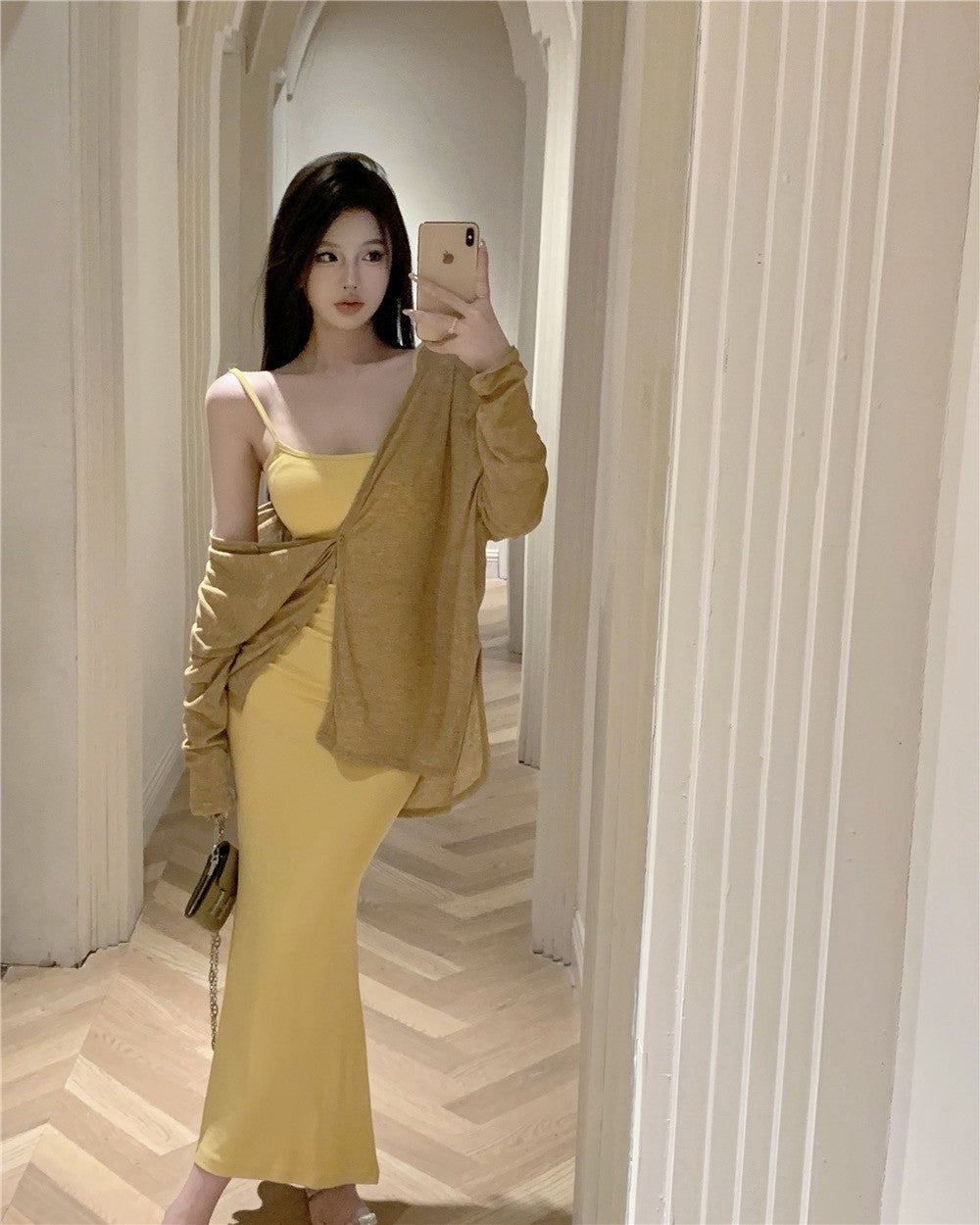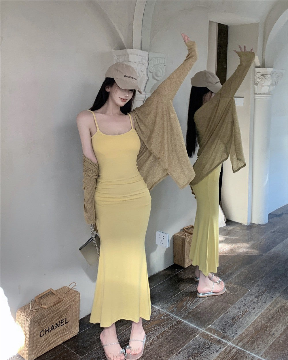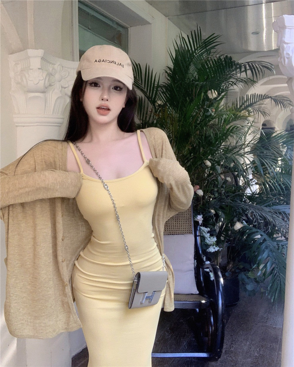NA+ 拿捏嫩呼奶黃skim吊帶連身裙 薑黃色開衫