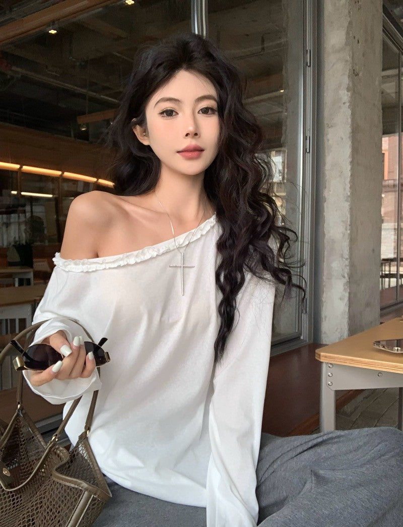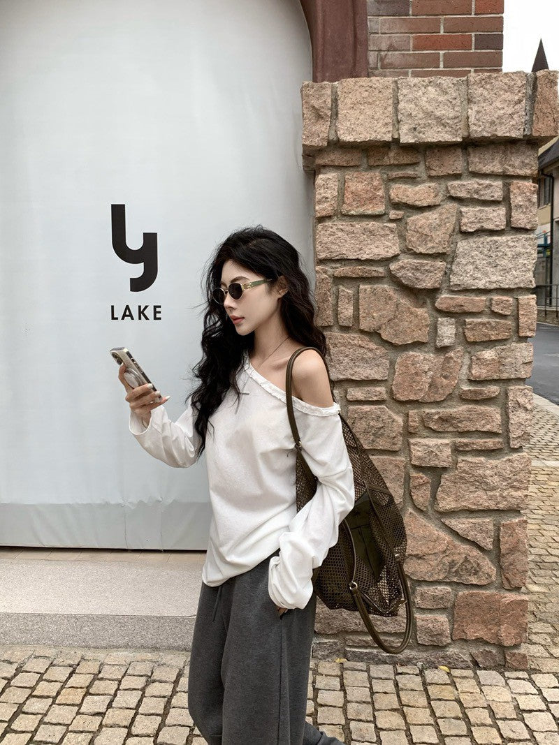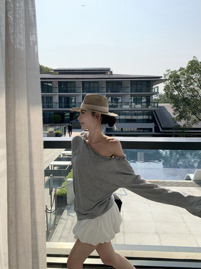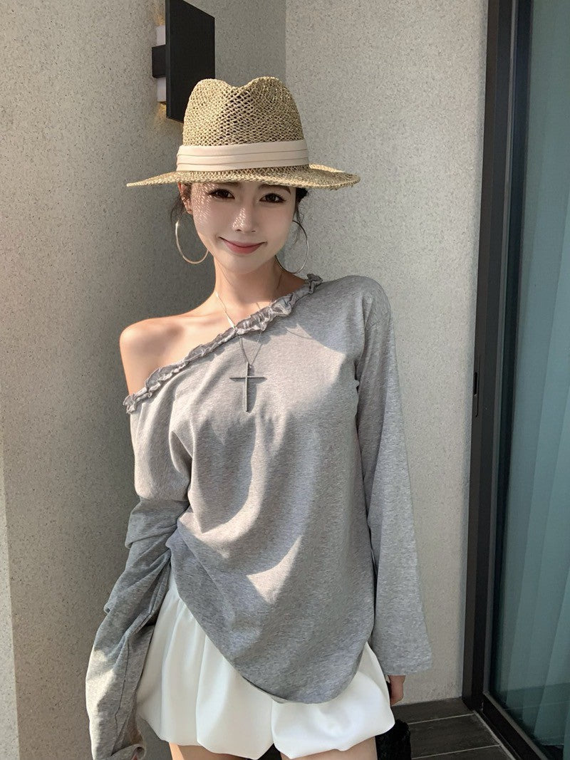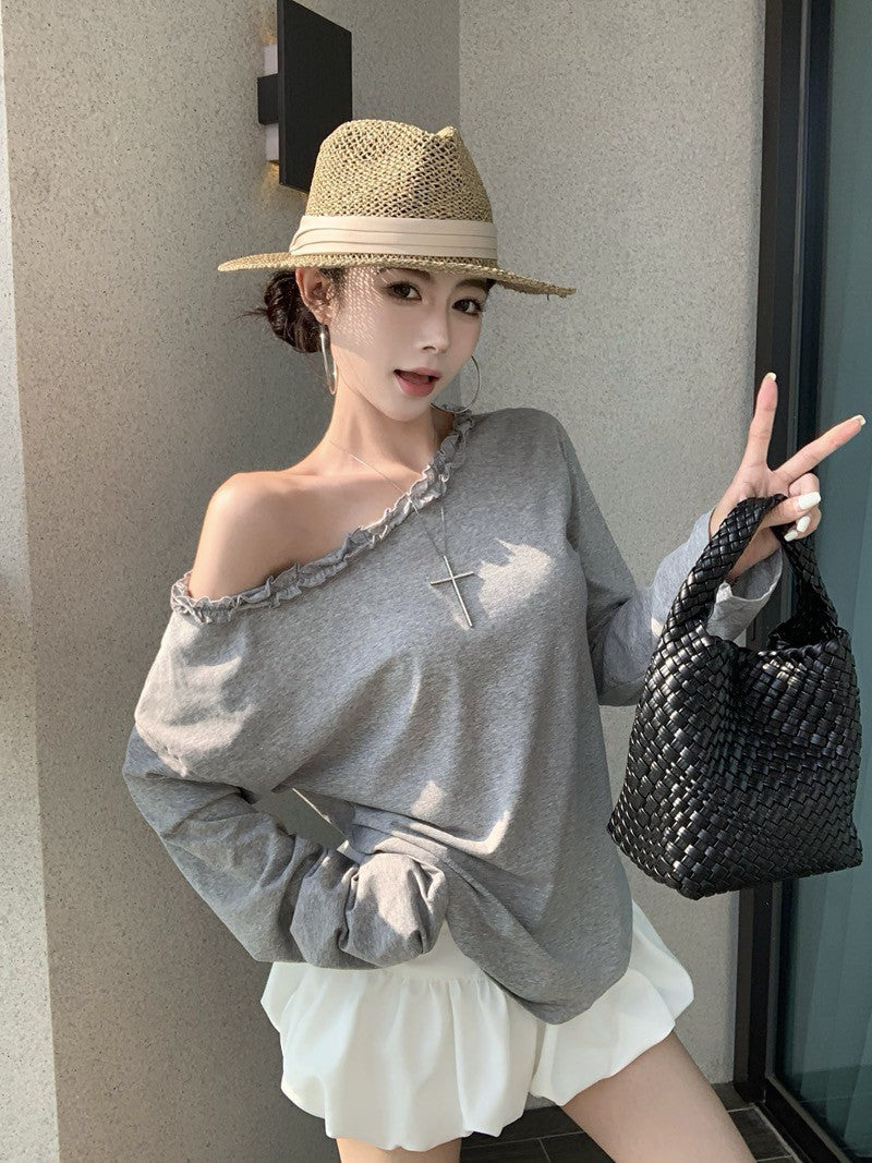 NA+ 推薦款*休閒花邊斜領寬鬆慵懶上衣 白/灰