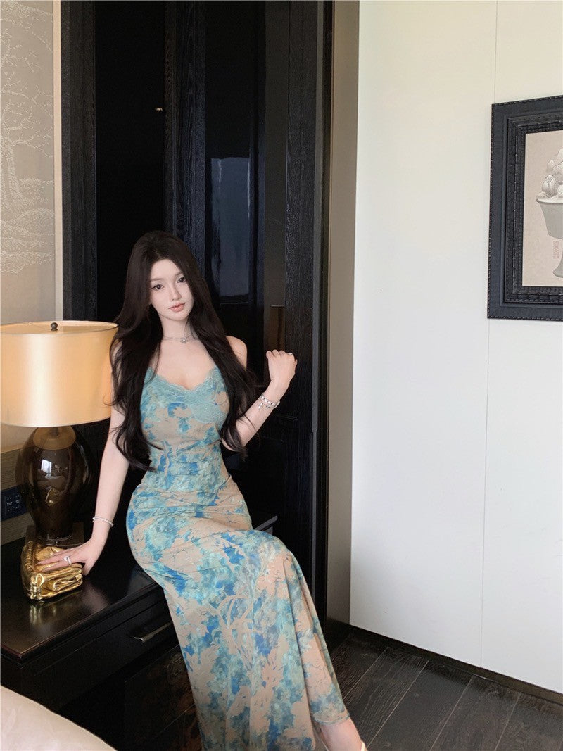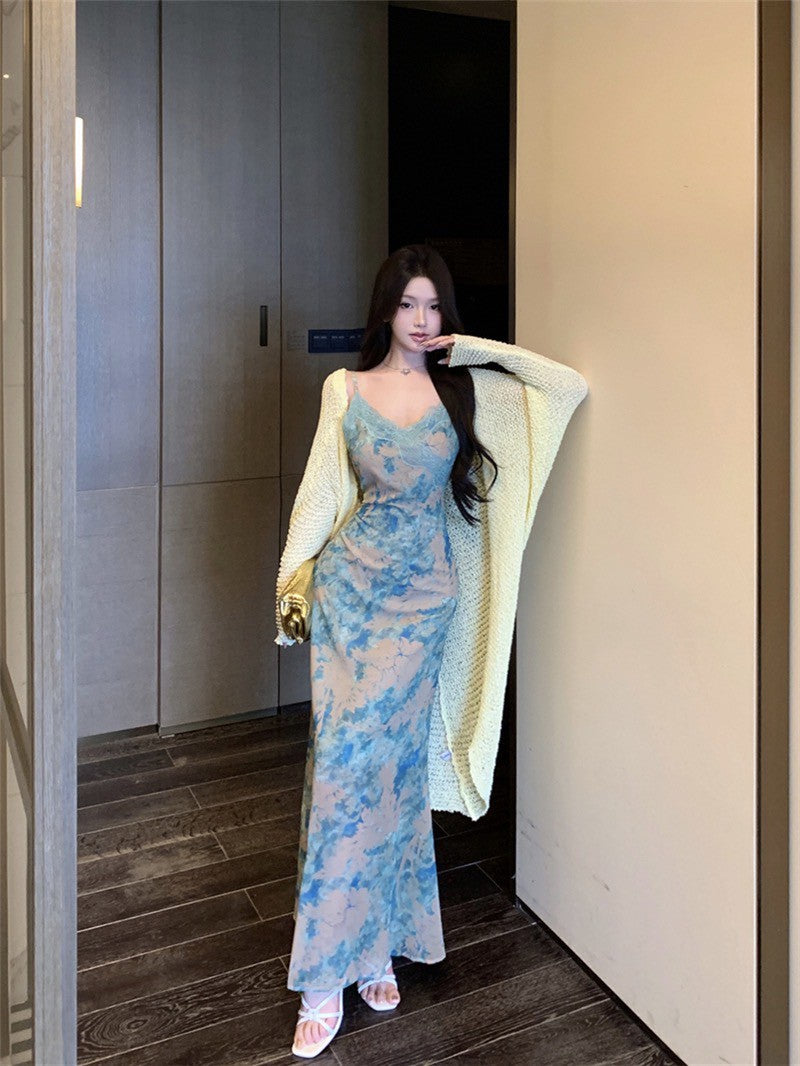 NA+ 斜裁花青綠暈染蕾絲連身裙 針織開衫