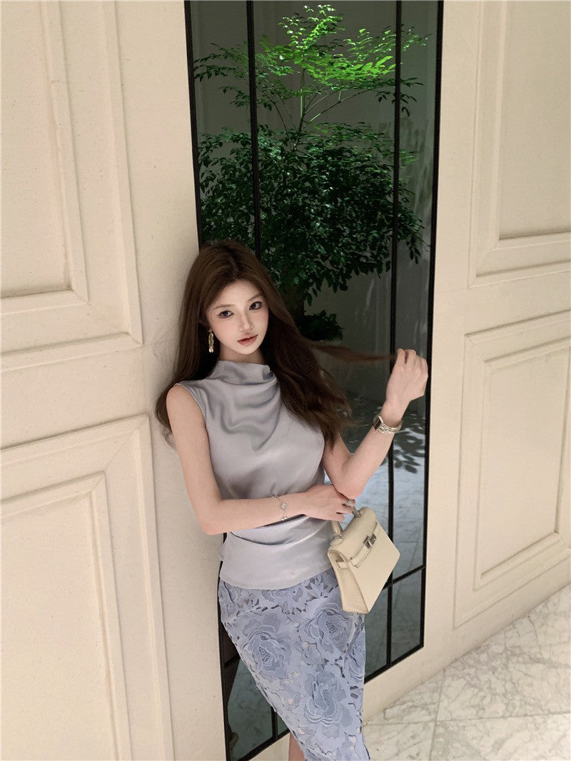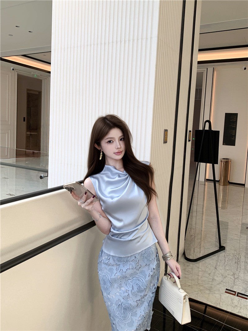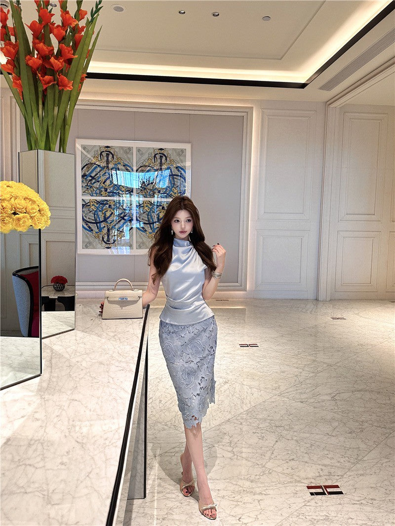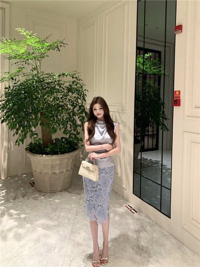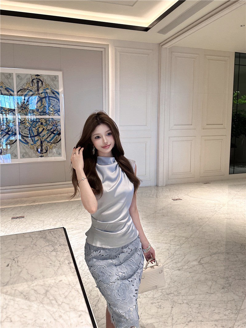 NA+ 明月藍花氣質褶皺緞面背心 蕾絲半身裙