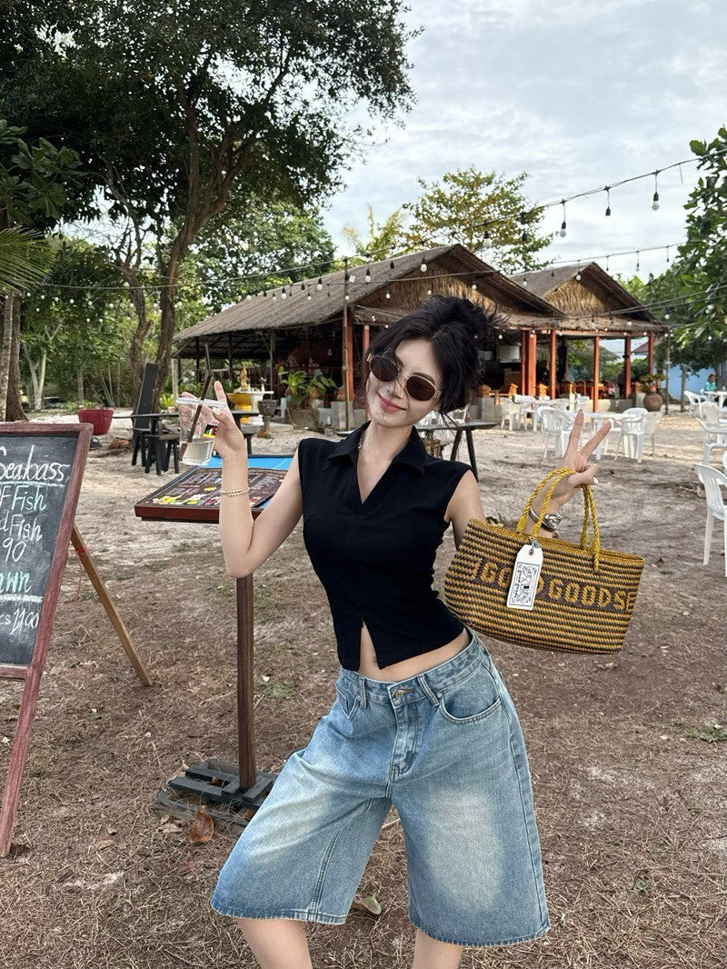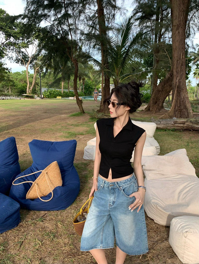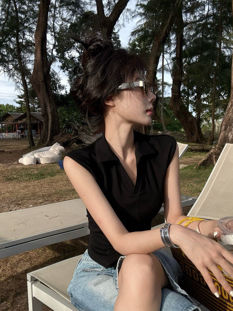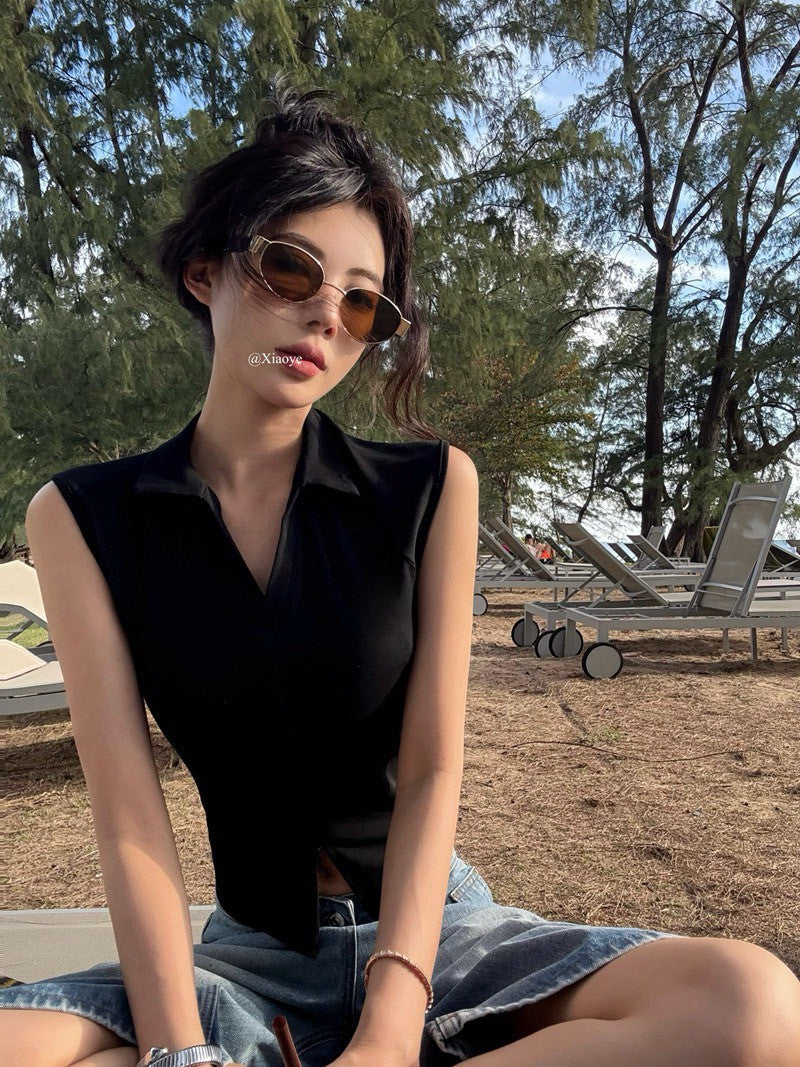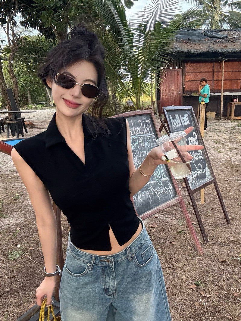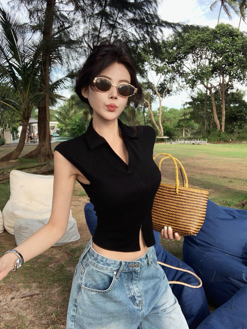 Na+ 時髦不插電 老錢polo領雙拉鏈背心 黑