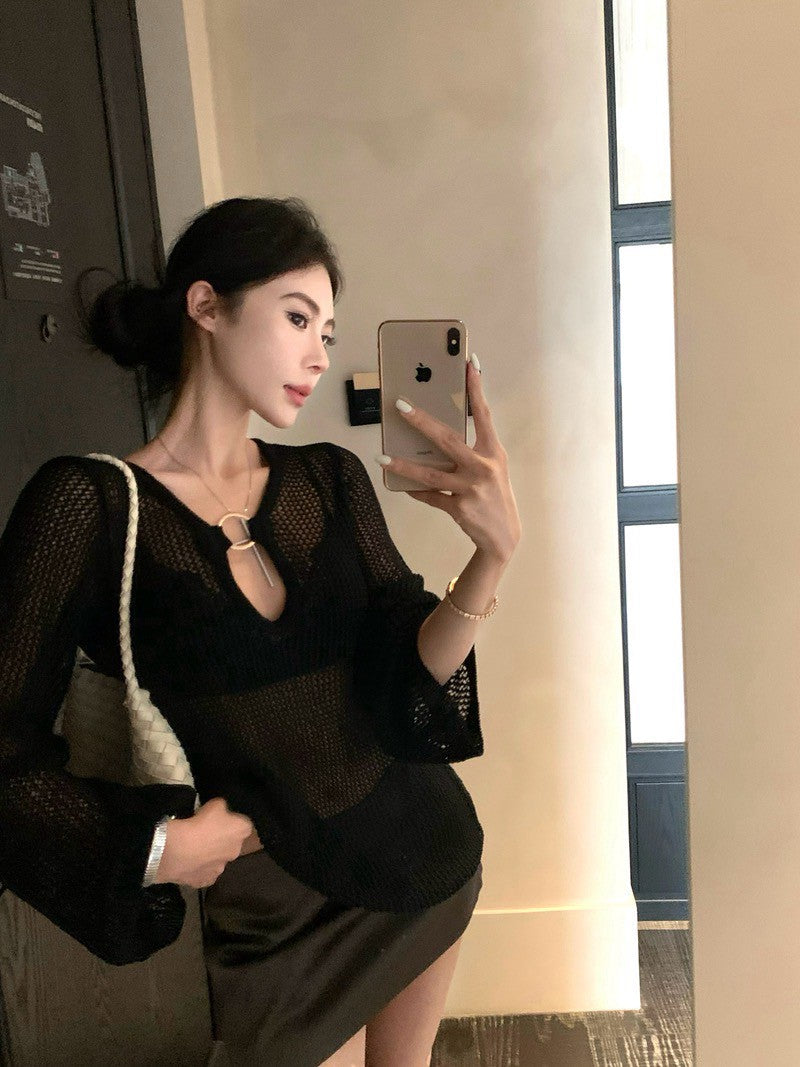 Na+ 時髦歐美老錢 V領縷空疊穿罩衣 黑