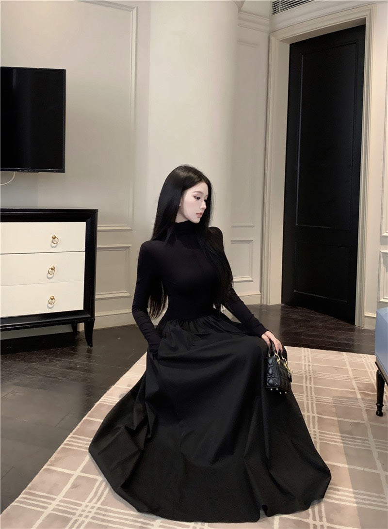 NA+ 暗黑女爵高領拼接針織連衣裙 黑