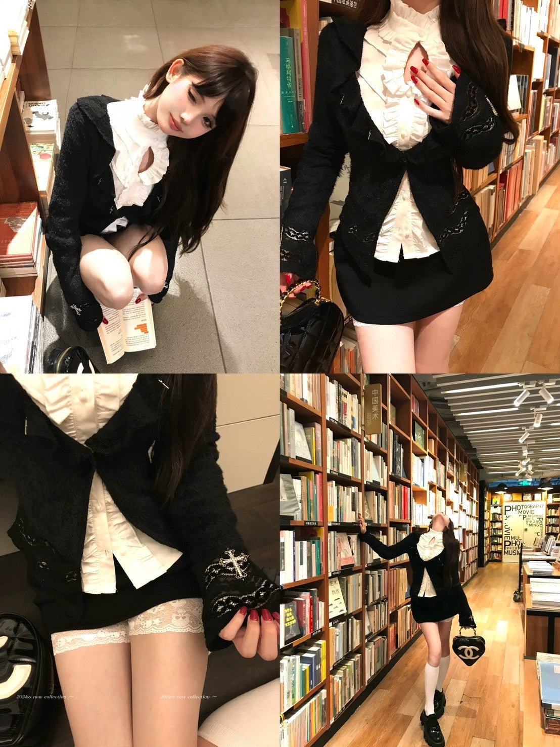 ''Na+''暗黑歌德 花邊修身白襯衫 厚磅毛衣外套 顯瘦黑色半身裙