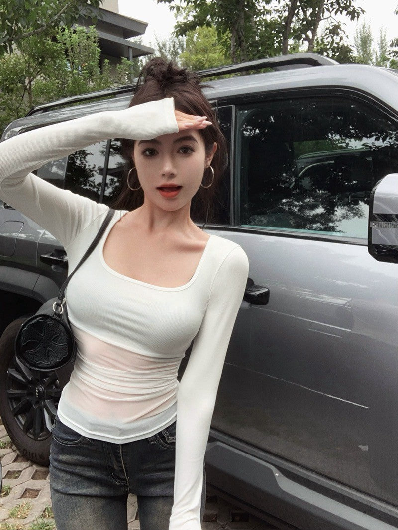 Na+ 極致方領顯瘦網紗拼接性感長袖上衣 白