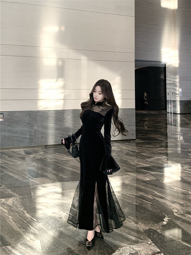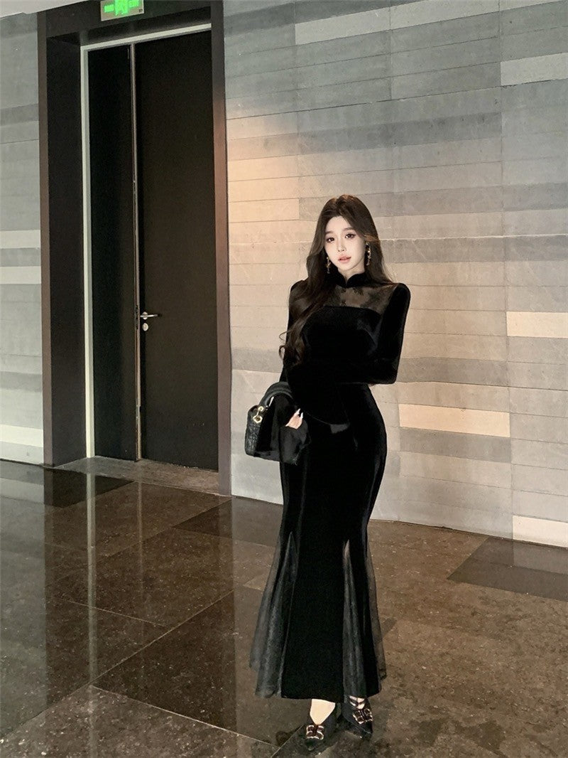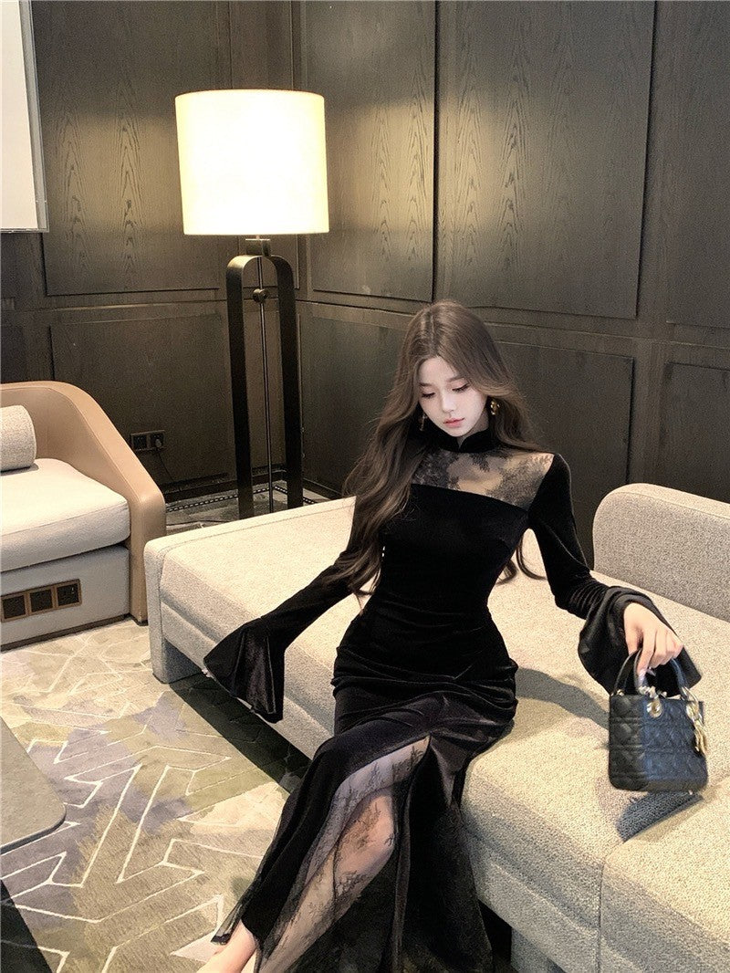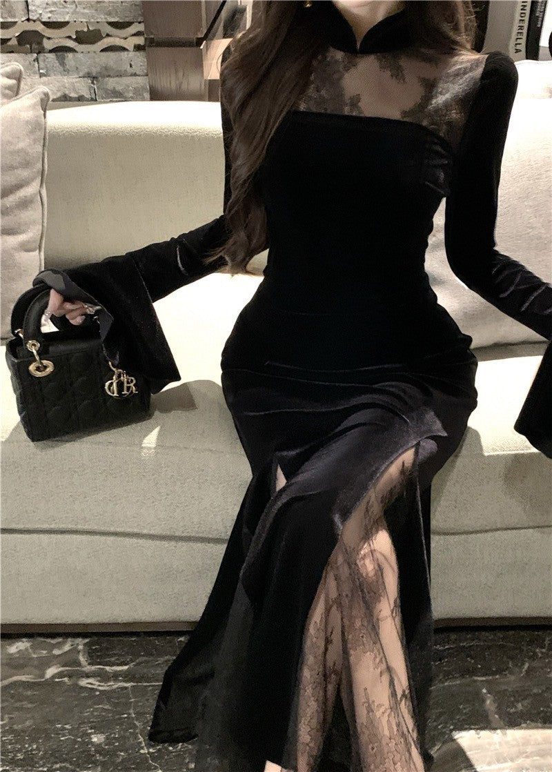 ''Na+''步步蓮升 復古旗袍式拼接絲絨連衣裙 黑