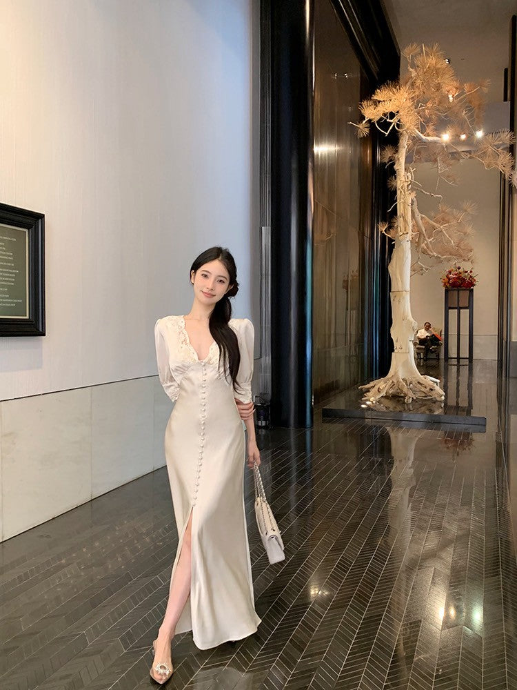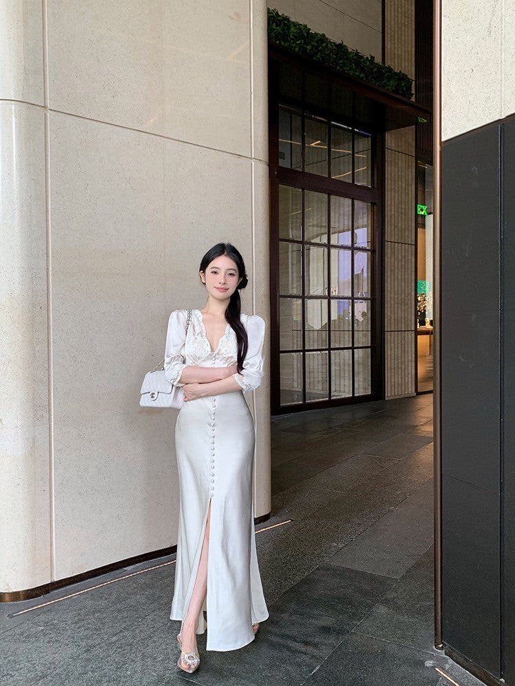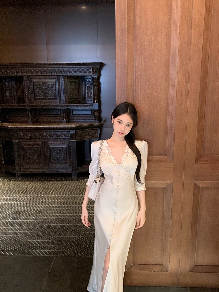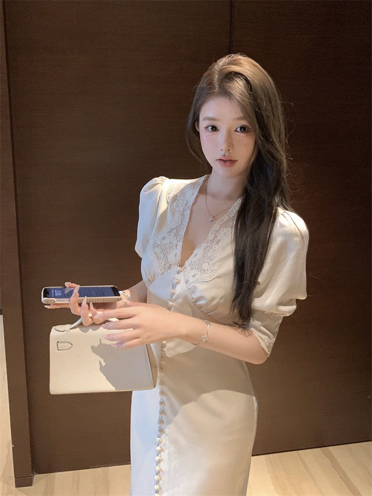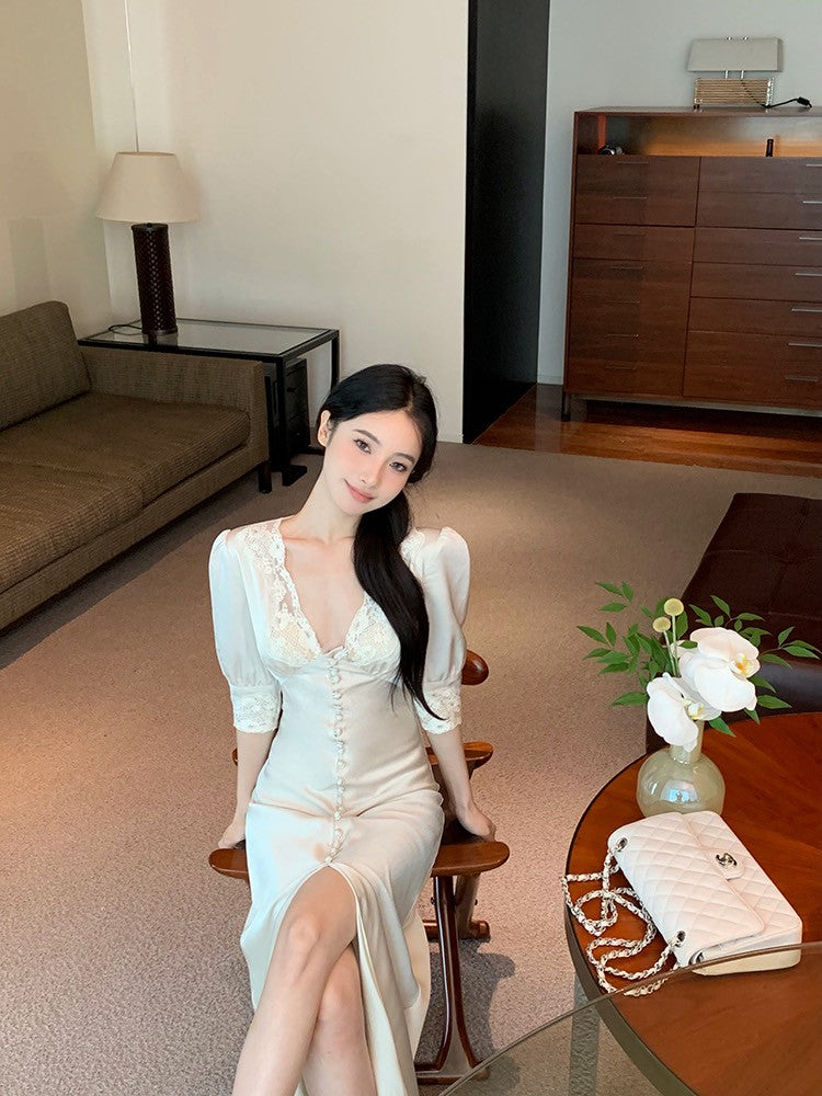 ''Na+''歲月靜好 氣質緞面公主蕾絲花拼接法式連身裙