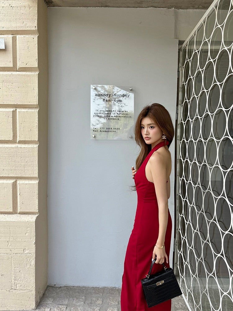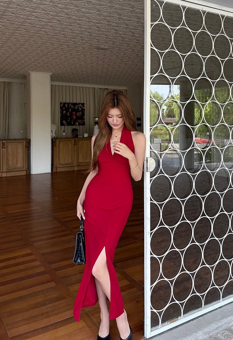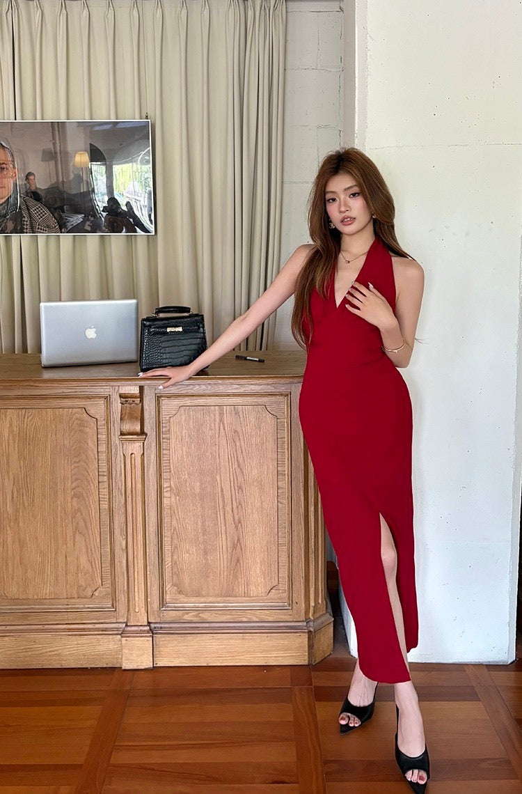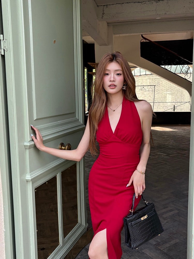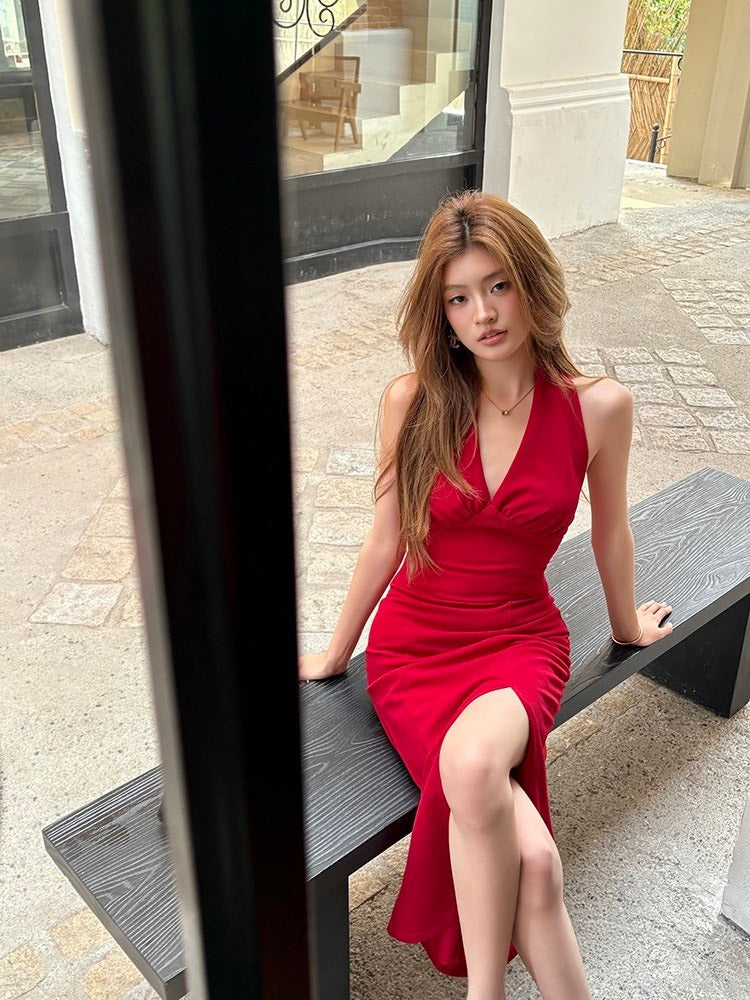 NA+ 氣質名媛 基礎V領掛脖修身連身裙 紅