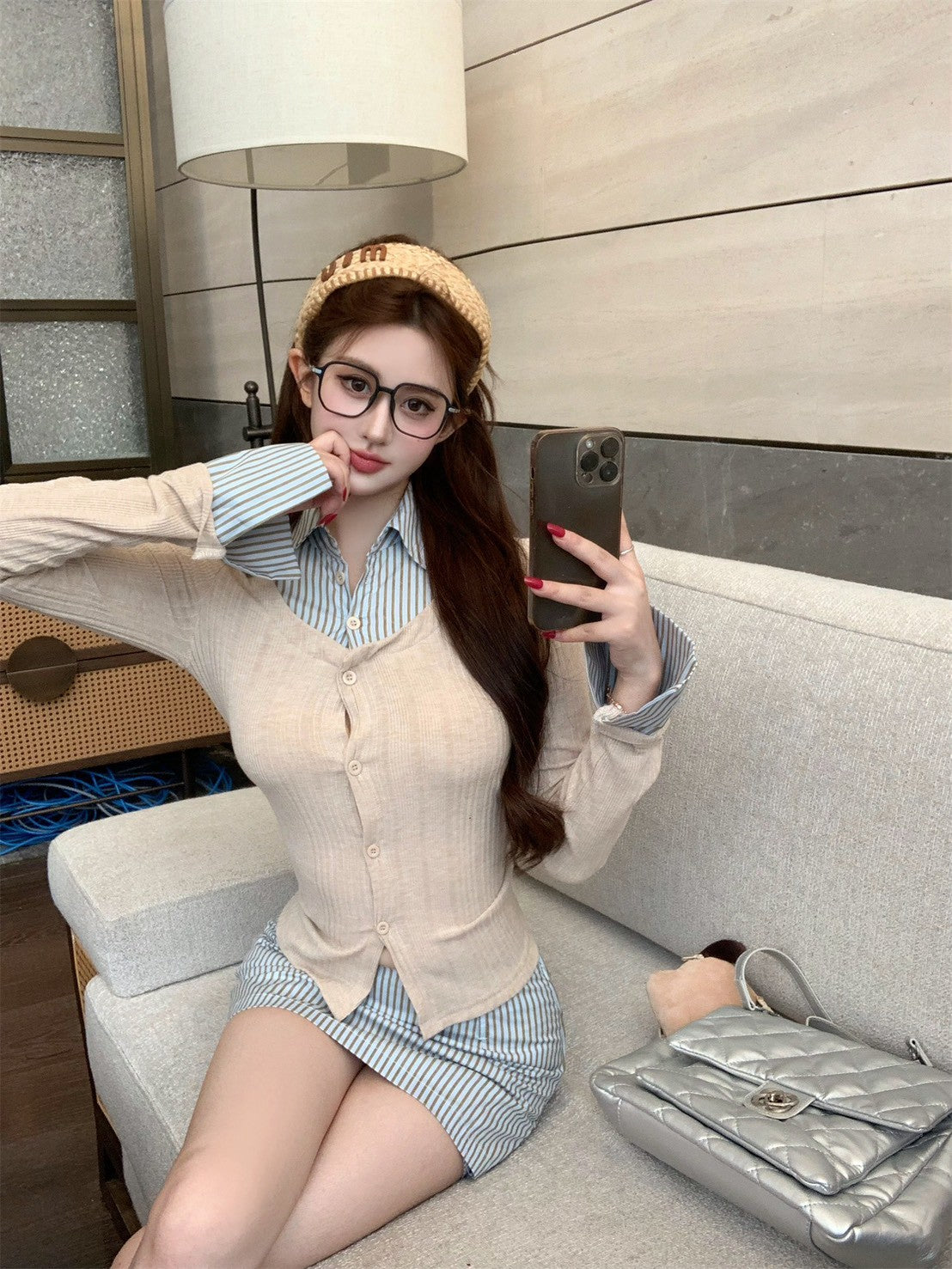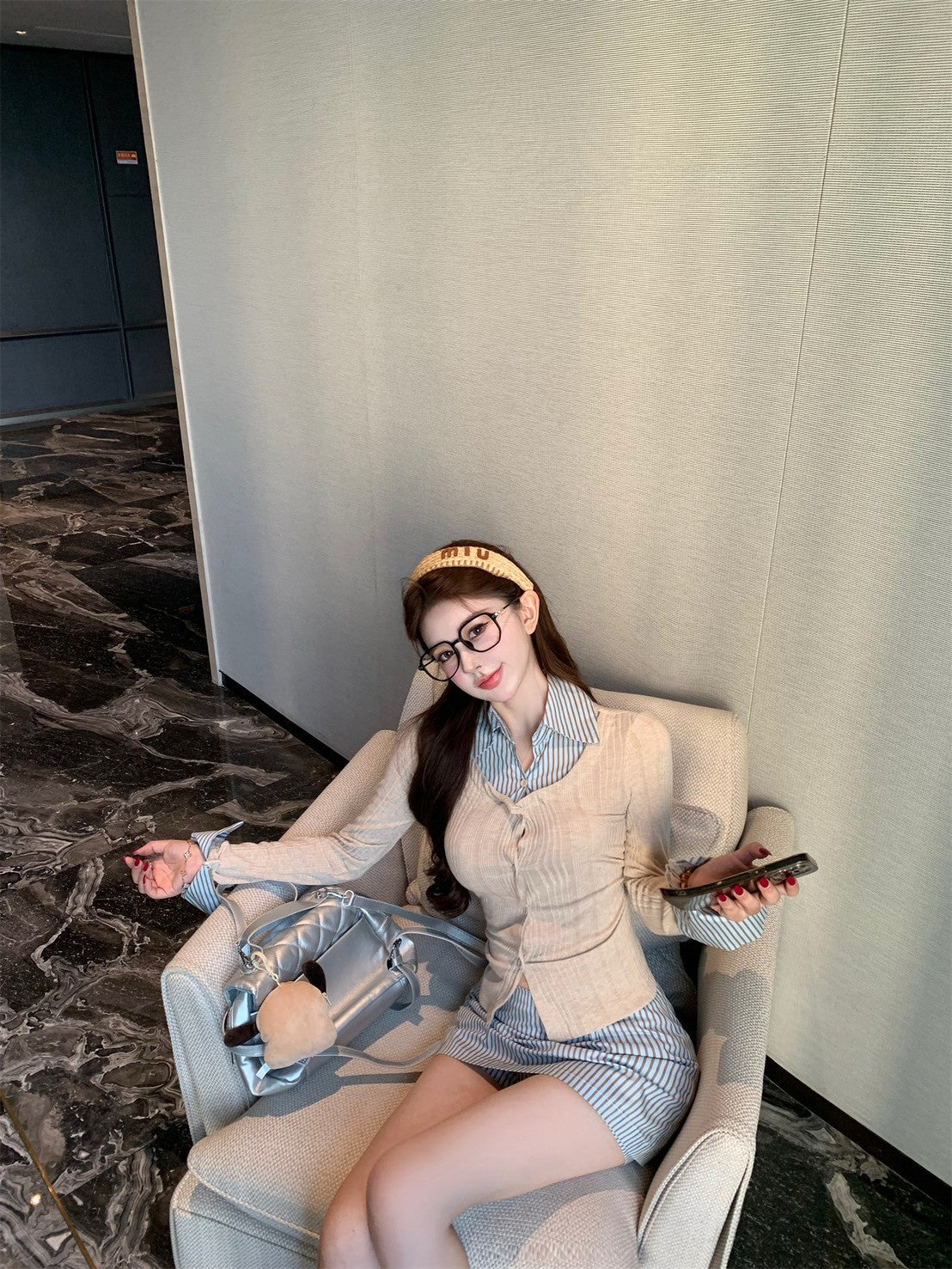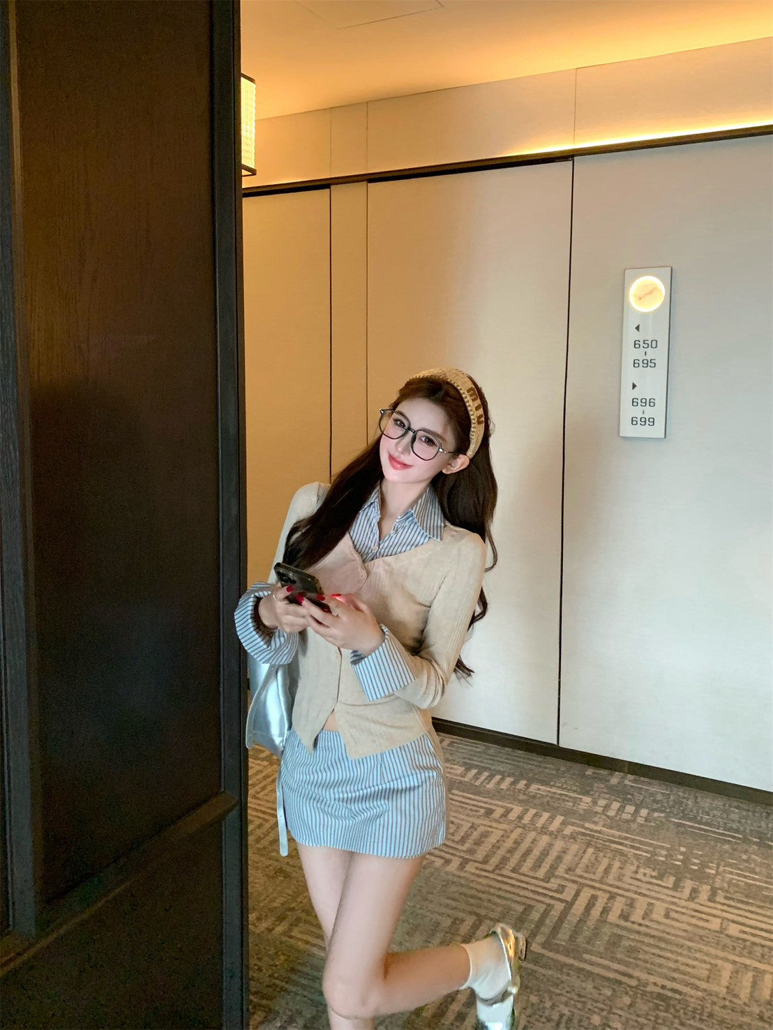 NA+ 氣質學院假兩件式條紋針織襯衫 條紋半身褲裙