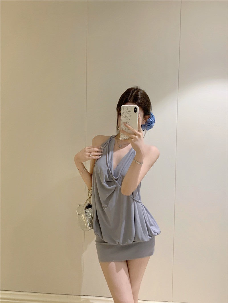 Na+ 氣質無菜單 蘯領露背顯瘦連身裙 藍