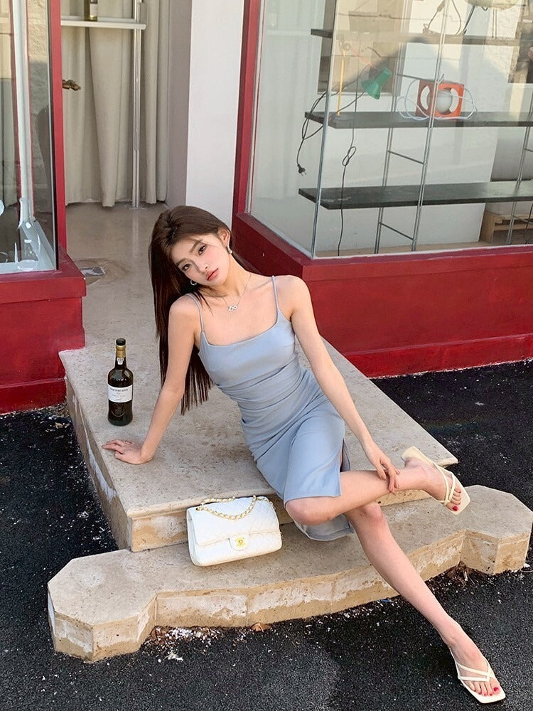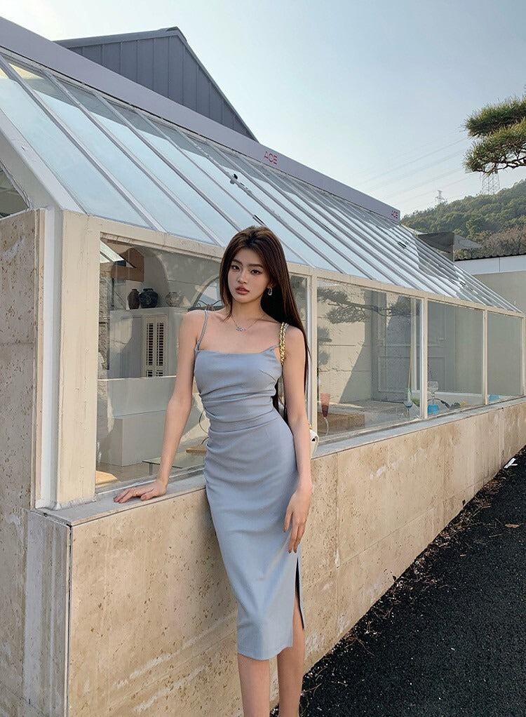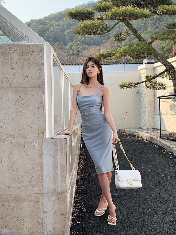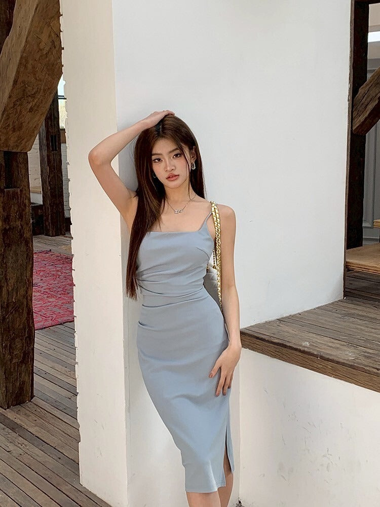 NA+ 氣質蔚藍色抓皺腰修身裙