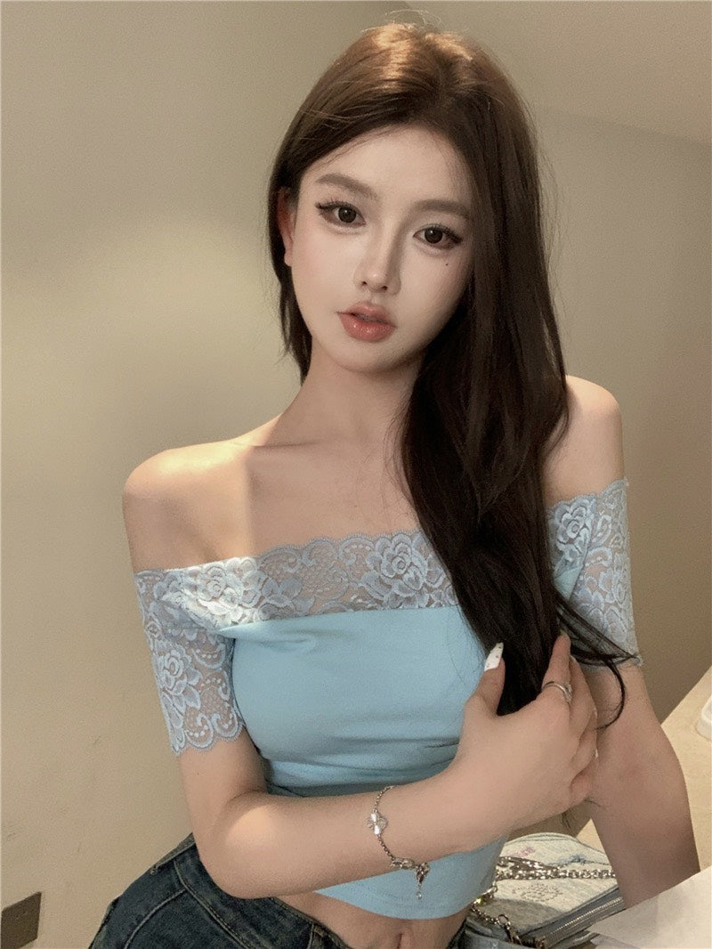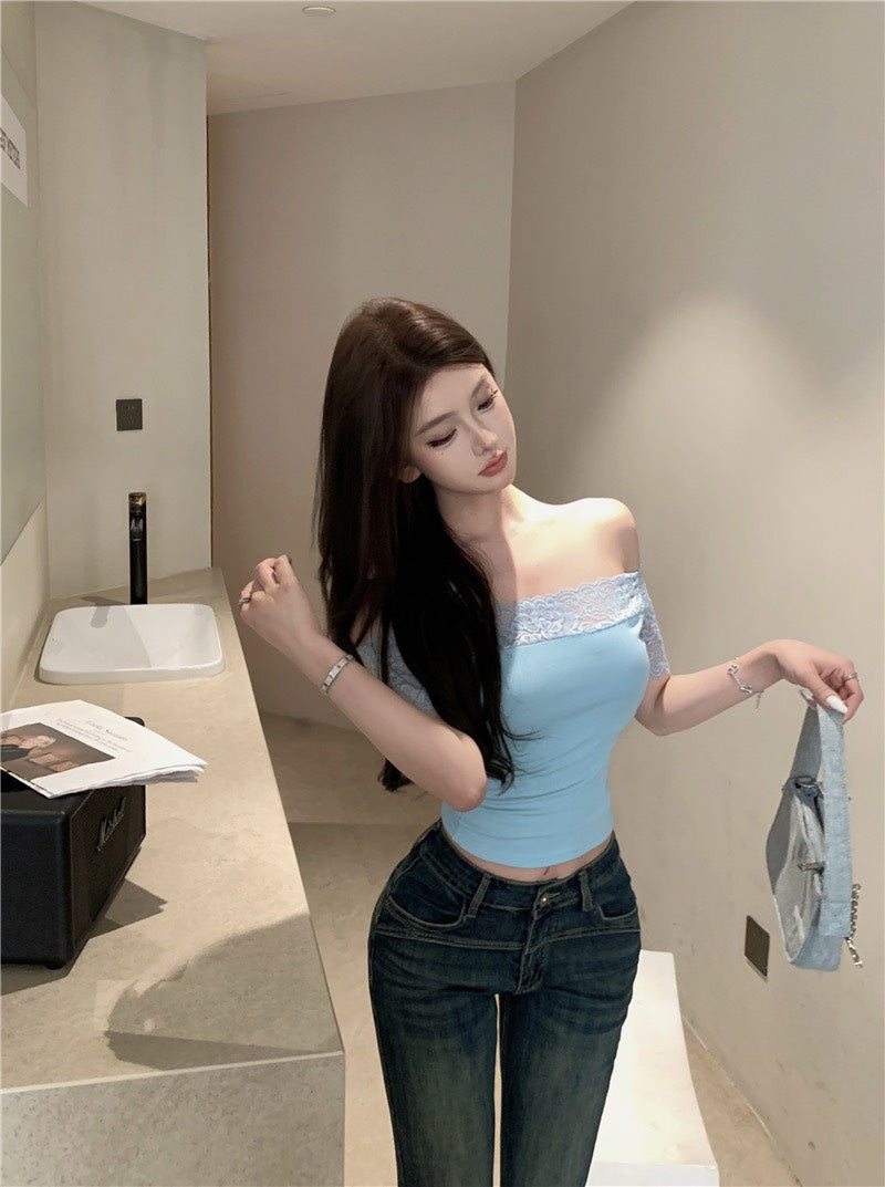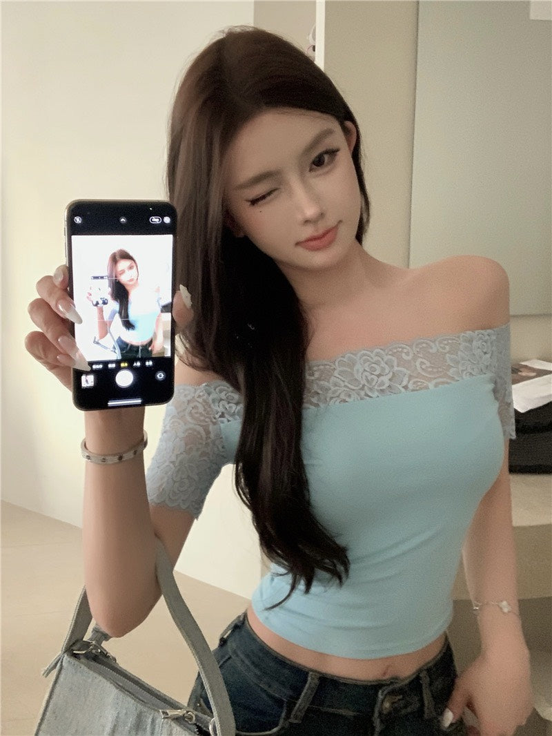 Na+ 氣質蕾絲一字領彈力上衣 藍