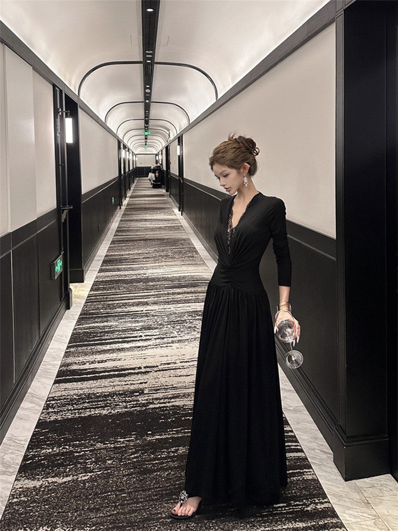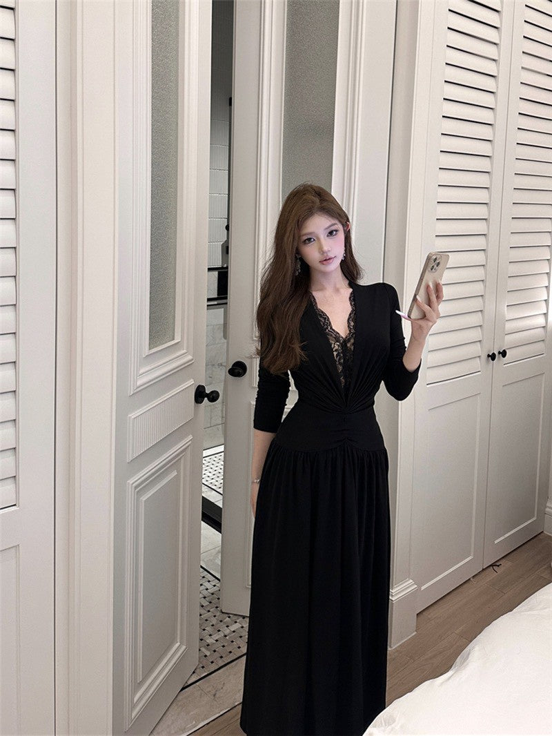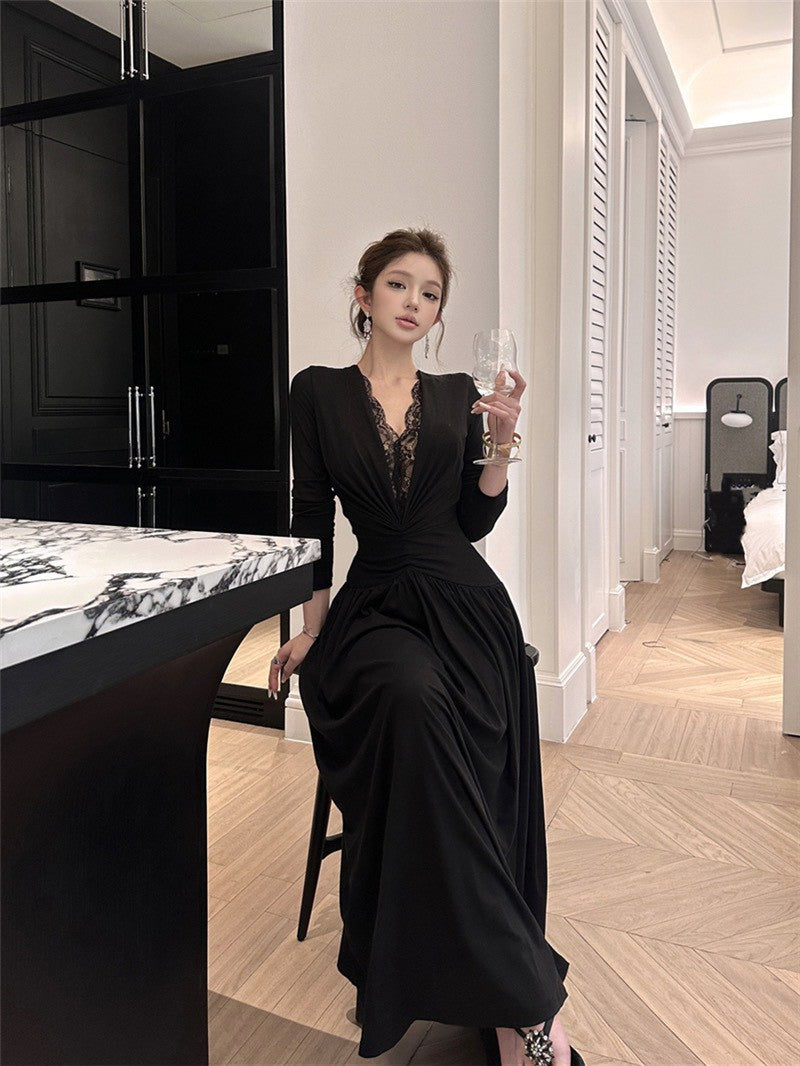 NA+ 法式黑浪漫V領蕾絲拼接連身裙