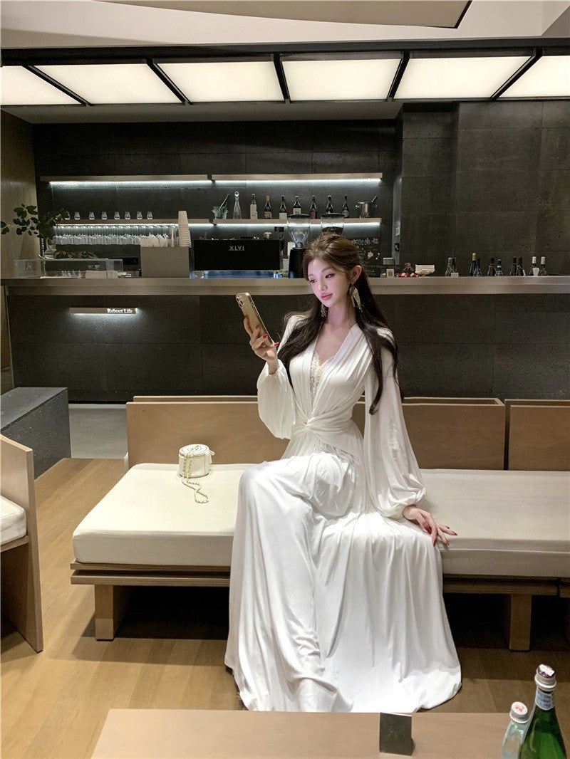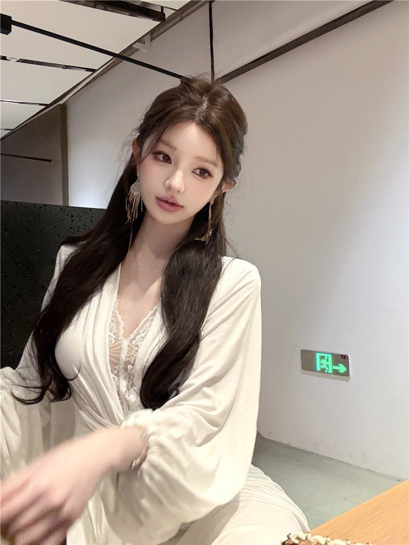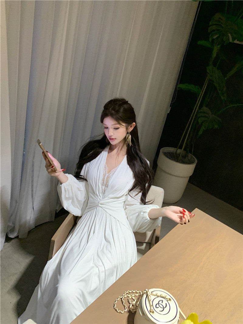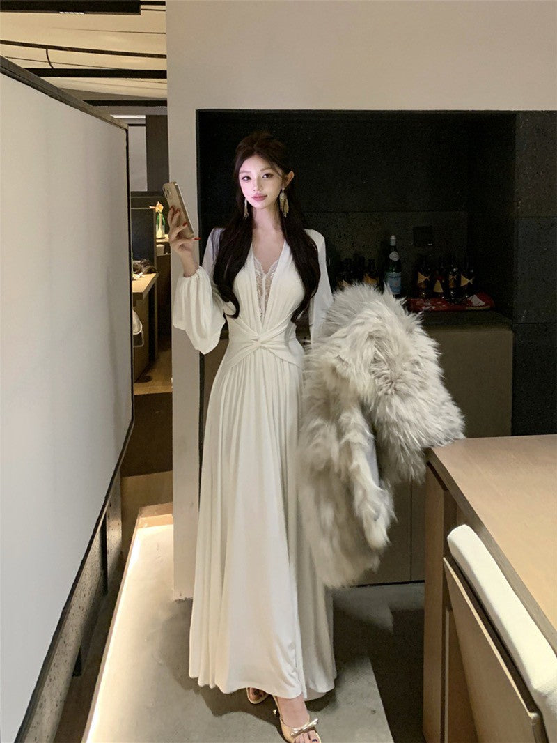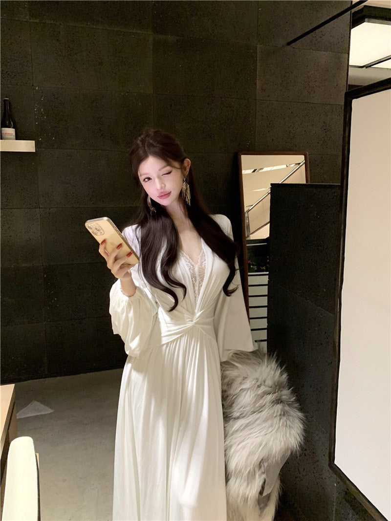 NA+ 淡香純慾蕾絲扭結拼接長款連身裙 白